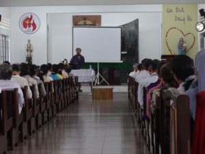 8g15 sáng thứ 7 là giờ chầu khai mạc tại nhà nguyện Tỉnh Dòng trong vòng 15 phút, xin Thiên Chúa thánh hóa và chúc lành cho khóa thường huấn này. Kế tiếp là bài chia sẻ của cha Dom. Nguyễn Đạt Tam, sss. theo chủ đề. Cha chia sẻ : Cử hành Thánh Thể chính là SỐNG MÀU NHIỆM VƯỢT QUA CỦA ĐỨC KI-TÔ. Đây chính là trung tâm của cuộc sống cá nhân, gia đình và cộng đoàn. Cử hành Thánh Thể còn là khởi điểm dẫn chúng ta đến hiểu biết về Thánh Thể và là nguồn cảm hứng giúp chúng ta cầu nguyện và dấn thân. Sau 2 giờ chia sẻ, cha còn cho chúng tôi câu hỏi để thảo luận và lắng nghe nhau theo nhóm, nhằm khởi động, đào sâu và nâng đỡ nhau trong ơn gọi là một Ki-tô hữu.