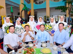 Sau Thánh lễ, quý Cha, quý Tu sĩ và quý thân nhân, quý khách đã chung chia niềm vui với Tỉnh dòng trong bữa tiệc thân ái chan hòa tình thương mà mọi người đã dành cho quý chị em Tân khấn sinh. Hội Dòng Nữ Tỳ Thánh Thể hôm nay có thêm các Nữ Tỳ dễ thương đầy nhiệt tâm để tôn thờ Thánh Thể và phục vụ Hội Thánh.