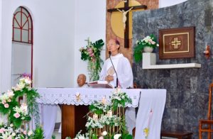 Trong bài giảng lễ, Đức Cha Gioan đã chia sẻ và nhắn nhủ với Cộng đoàn phụng vụ, đặc biệt với Tỉnh Dòng và các Tân khấn sinh: “Đức Cha chúc mừng Tỉnh Dòng Nữ Tỳ Thánh Thể hôm nay có các chị em tuyên khấn, và Chúa Nhật tới đây Mừng Đại Lễ của Chúa “Fête Dieu”, Kính trọng thể Mình Máu Chúa Kitô. Hôm nay ngày lễ Mẹ Thăm Viếng, Mẹ đã cưu mang Con Thiên Chúa trong lòng và Mẹ đến với bà Elizabeth. Khi chúng ta tham dự Lễ khấn, cuộc đời chúng ta cũng được nâng cao lên, ta hướng đời ta lên Chúa, vì cuộc đời của một người dâng hiến, được Thánh hiến cho Thiên Chúa. Những người sống đời Thánh hiến là người để Thiên Chúa huấn luyện mình trở thành những người biết yêu thương. Như Chúa Giêsu đã huấn luyện các Tông đồ, thì đời người dâng hiến cũng được huấn luyện, nâng lên để cả cuộc đời nên lời ngợi ca Thiên Chúa. Chúa Giêsu huấn luyện 12 Tông đồ, các ông được học với Chúa, sống với Chúa-là hành trình thiết thân với Chúa, không rời Thầy một bước, từ lúc cùng Thầy bước xuống sông Gio-đan, khi Thầy chịu Phép rửa, hay lúc Thầy dự tiệc cưới Cana và chứng kiến phép lạ đầu tiên, cho đến lúc Thầy chịu chết, rồi đến khi Thầy Sống lại và Về Trời. Chúa huấn luyện và dẫn các Tông đồ theo Chúa, nhưng các ông vẫn chưa hiểu, cần phải có Chúa Thánh Thần và nhờ ơn Chúa Thánh Thần… Vậy người sống đời Thánh hiến hãy cùng với Chúa Thánh Thần, gắn bó với Chúa Thánh Thần, cầu nguyện với Chúa Thánh Thần luôn luôn. Và hãy trung tín với Hội Thánh vì Hội Thánh và Chúa Kitô là một. Chúa Kitô là đầu, Hội Thánh là thân mình. Vậy người sống đời Thánh hiến hãy luôn gắn bó với Hội Thánh. Hãy khiêm tốn đón nhận con đường huấn luyện của Chúa, xin Chúa Thánh Thần hướng dẫn chúng ta.”