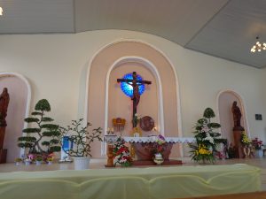 Khoảng 7h30, chuyến xe đầu tiên đã dừng bánh. “Ave Maria! Chúng con đã về, Mẹ ơi!” Gần 80 “đứa con nhỏ” của Mẹ giờ mới có dịp được đến cùng mẹ. Bầu trời Núi Cúi như cùng hòa chung niềm vui sum vầy trong tình Mẹ con – ánh nắng rực rỡ chan hòa khắp nơi. Trung tâm hành hương Đức mẹ Núi Cúi đang trong giai đoạn xây dựng nên đoàn xe của chị em chúng con chưa thể lên núi được nhưng thay vào đó chúng con được di chuyển sang nhà nguyện cách đó 500m để chào Cha quản nhiệm và nói lên mong muốn của mình. Hạnh phúc thay sau cuộc trò chuyện ngắn, cha đã cử người đưa tất cả chúng con lên núi để tham quan công trình nhà Mẹ đang còn dang dỡ, bầu không khí thanh tịnh và trong lành nơi đây làm cho chúng con được thoải mái và tươi vui hơn nhiều sau 2g đồng hồ ngồi xe.