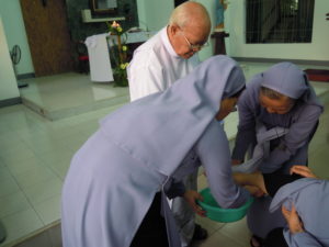 Tiếp theo, Cha chủ tế ngỏ lời: vì Đức Thánh Cha Phanxicô đã rửa chân cho cả những người nữ trong cử hành phụng vụ, nên hôm nay cộng đoàn chúng ta cũng thực hiện cho các chị em trong Thánh lễ. Cha chủ tế cùng hai chị bề trên đã rửa chân cho một số chị em đại diện. Cử chỉ rửa chân giờ đây chỉ là tượng trưng, nhưng các chị bề trên ý thức rằng trách nhiệm của các chị trong cộng đoàn mãi mãi vẫn là phục vụ, là cúi mình hiến thân phục vụ từng chị em, như tâm tình chị em qua bài Lời Trăn Trối “Yêu thương, con nhớ Thầy xưa đã truyền, yêu nhau như Thầy hy sinh mạng sống, như Thầy đã hiến mình…Thầy quỳ rửa chân cho con, dạy con phải khiêm tốn, hy sinh, quên mình…” Và các chị em cũng hạnh phúc đón nhận tình yêu phục vụ của các chị.