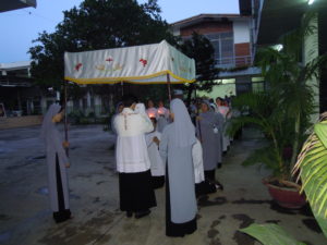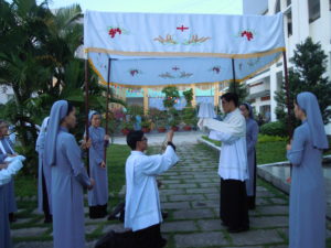 Sau Thánh Lễ là cung nghinh Thánh Thể sang nhà chầu tạm. Tất cả cộng đoàn phụng vụ cùng theo đoàn rước với lời ca tôn thờ ngân vang “Người ơi, nào mau tới thờ lạy Chúa….” Phần kiệu Mình Thánh được quí thầy Dòng Thánh Thể phụ trách thật trang nghiêm, sốt sắng.