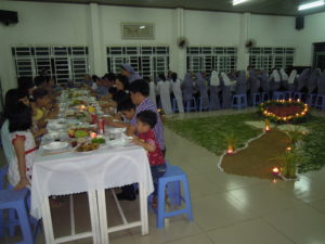 Tiếp nối phụng vụ Thánh Thể, là bữa ăn huynh đệ nơi phòng tiệc ly cộng đoàn được trang trí hoa nến trong bầu khí linh thiêng. Hôm nay, thật đặc biệt, cộng đoàn tái diễn lại bữa tiệc vượt qua năm xưa của người Do Thái, có phần giới thiệu về bữa tiệc, hỏi đáp, hát Thánh Vịnh, và các chị bề trên cắt bánh, rót rượu cho các chị em. Bữa tiệc có sự hiện diện của tất cả anh chị em giáo dân bên ngoài cùng tham dự.