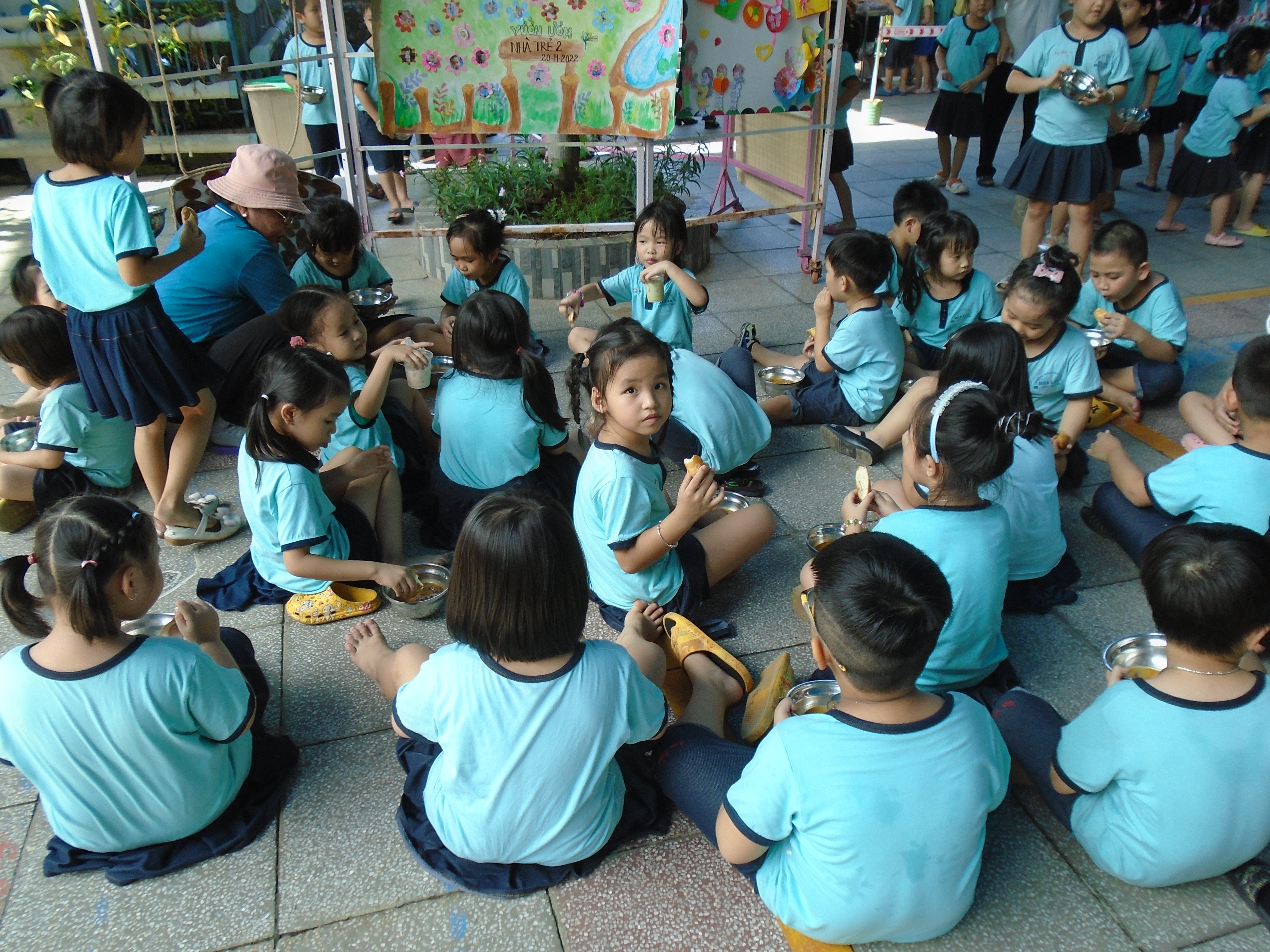 Các cháu cũng có dịp thực hành lễ giáo đã được hoc như: xếp hàng, bỏ rác đúng nơi quy định…Dù vậy bữa ăn trưa cũng rất náo nhiệt, các cô và Ban Phụ Huynh cũng rất vất vả khi giúp các cháu xếp hàng, ăn uống…