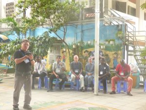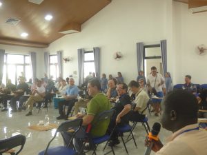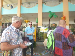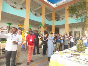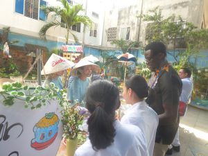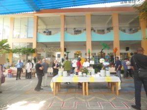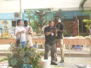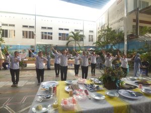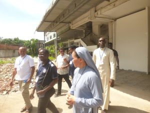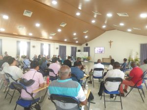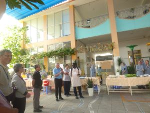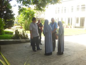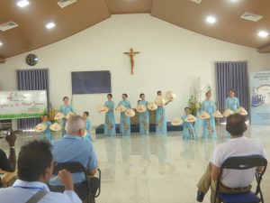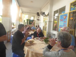 Tiếp tục, quý Thành viên dời bước lên nhà hưu và phòng hội. Mặc dù khí hậu nóng và đã trễ giờ, nhưng quý thành viên rất vui vẻ và thân thiện trò chuyện. Chị nguyên Giám Tỉnh ngỏ lời hân hoan chào đón Cha Tổng quyền và quý cha Thành viên Tổng Tu Nghị. Quý Thành viên đón xem tiết mục múa về quê hương với áo dài nón lá của các em Học viện. Và theo dõi trình chiếu về sứ vụ, các sinh hoạt và các cộng đoàn của Tỉnh dòng Nữ Tỳ Thánh Thể Việt nam. Mục cuối, quý Cha tiến vào khu ẩm thực sân vườn trưng bày các món ăn tây ta được trang trí thật bắt mắt. Cha Tổng quyền đã cảm ơn quý chị Tỉnh dòng Việt nam đã đón tiếp nồng hậu. Cha mong mọi người chia sẻ bữa ăn này với tình huynh đệ trong ngày Giáo hội cầu nguyện cho người nghèo và chúng ta được mời gọi chung tay nỗ lực hỗ trợ người nghèo. Vậy mỗi người chúng ta hãy cùng đọc chung lời kinh Lạy Cha theo ngôn ngữ của mình. Sau Kinh Lạy Cha, tất cả cùng thưởng thức những món ăn trong niềm vui, trò chuyện, thăm hỏi, hát cho nhau nghe. Và các cháu trường Khiếm thính, các em Dự tu cũng có những tiết mục góp vui thật dễ thương.