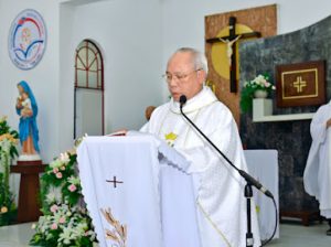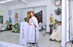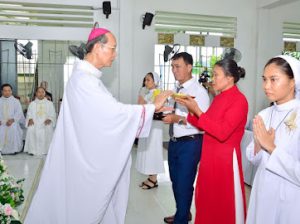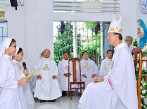Trong bài giảng lễ, Đức Cha Gioan đã chia sẻ và nhắn nhủ với Cộng đoàn phụng vụ, đặc biệt với Tỉnh Dòng và các Tân khấn sinh: “Đức Cha chúc mừng Tỉnh Dòng Nữ Tỳ Thánh Thể hôm nay có các chị em tuyên khấn, và Chúa Nhật tới đây Mừng Đại Lễ của Chúa “Fête Dieu”, Kính trọng thể Mình Máu Chúa Kitô. Hôm nay ngày lễ Mẹ Thăm Viếng, Mẹ đã cưu mang Con Thiên Chúa trong lòng và Mẹ đến với bà Elizabeth. Khi chúng ta tham dự Lễ khấn, cuộc đời chúng ta cũng được nâng cao lên, ta hướng đời ta lên Chúa, vì cuộc đời của một người dâng hiến, được Thánh hiến cho Thiên Chúa. Những người sống đời Thánh hiến là người để Thiên Chúa huấn luyện mình trở thành những người biết yêu thương. Như Chúa Giêsu đã huấn luyện các Tông đồ, thì đời người dâng hiến cũng được huấn luyện, nâng lên để cả cuộc đời nên lời ngợi ca Thiên Chúa. Chúa Giêsu huấn luyện 12 Tông đồ, các ông được học với Chúa, sống với Chúa-là hành trình thiết thân với Chúa, không rời Thầy một bước, từ lúc cùng Thầy bước xuống sông Gio-đan, khi Thầy chịu Phép rửa, hay lúc Thầy dự tiệc cưới Cana và chứng kiến phép lạ đầu tiên, cho đến lúc Thầy chịu chết, rồi đến khi Thầy Sống lại và Về Trời. Chúa huấn luyện và dẫn các Tông đồ theo Chúa, nhưng các ông vẫn chưa hiểu, cần phải có Chúa Thánh Thần và nhờ ơn Chúa Thánh Thần… Vậy người sống đời Thánh hiến hãy cùng với Chúa Thánh Thần, gắn bó với Chúa Thánh Thần, cầu nguyện với Chúa Thánh Thần luôn luôn. Và hãy trung tín với Hội Thánh vì Hội Thánh và Chúa Kitô là một. Chúa Kitô là đầu, Hội Thánh là thân mình. Vậy người sống đời Thánh hiến hãy luôn gắn bó với Hội Thánh. Hãy khiêm tốn đón nhận con đường huấn luyện của Chúa, xin Chúa Thánh Thần hướng dẫn chúng ta.”