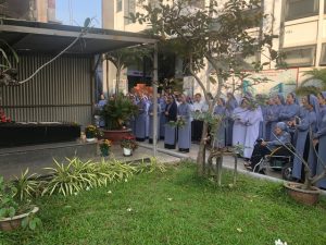 Từ sáng sớm, các chị em Nữ Tỳ từ các Cộng đoàn xa đã trở về nhà chính. 7g30 chị em quy tụ trước phần mộ của Cha Cố Micae để kính viếng và bày tỏ tấm lòng biết ơn Cha cố.