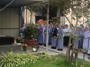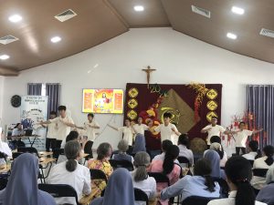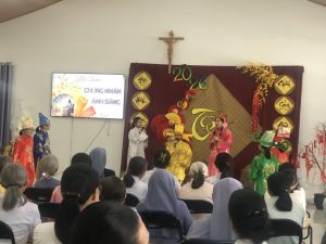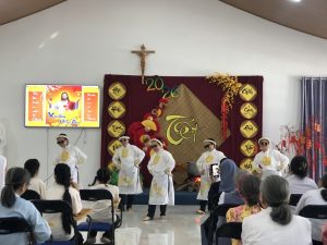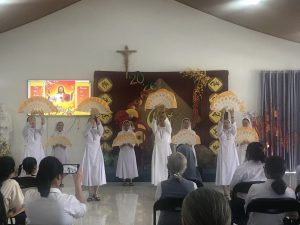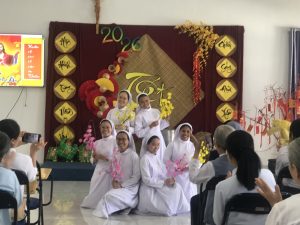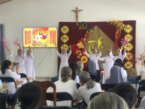 9g chị em tiến về phòng hội Tỉnh Dòng để cùng nhau hiệp thông đón Xuân mới qua những vũ điệu Xuân -Tết của các cháu khiếm thính, các em Dự tu, Tập viện, Học viện và cả các chị khấn trọn Cộng đoàn nhà chính, Cộng đoàn Tân Cang, và sớ Táo Quân do chị em Cộng đoàn Hoàng Mai diễn.