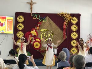 Tiết mục cuối của các em Dự tu “ Xuân của những ước mơ” diễn tả tâm tư của quý chị sứ vụ nước ngoài xa quê hương mỗi mùa Xuân về Tết đến.