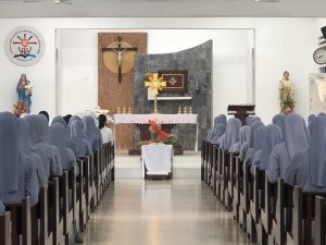 7g50 chị em trở về bên Chúa trong ngôi nhà nguyện tuy nhỏ bé nhưng ấm áp. Chị em cùng tôn thờ Thánh Thể để cảm tạ biết bao Hồng ân Thiên Chúa ban trong suốt năm qua.