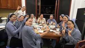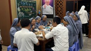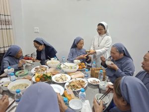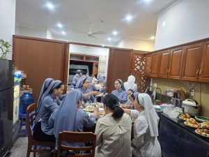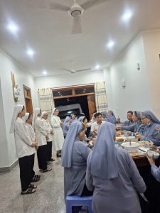 Tiếp đó, chị em dùng bữa tối huynh đệ cùng cộng đoàn Nữ tỳ Thánh Thể Núi Cúi. Bữa ăn diễn ra trong bầu khí ấm áp, thân tình và hiệp thông, nối dài niềm vui của ngày lễ.