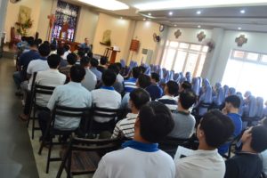 Sau đó là giờ chia sẻ của Cha Phaolô Vũ Chí Hỷ với đề tài “ Tuổi trẻ và ơn gọi Thánh Thể”. Bài chia sẻ đã nói đến ơn gọi của chúng tôi là một ân ban tuyệt vời mà Thiên Chúa đã dành tặng cho mỗi người chúng tôi. Tiếp đến là mục giải đáp thắc mắc. Chúng tôi hăng say nêu những thắc mắc và được hai cha giáo : Cha Giuse và Cha Phaolo giải đáp rõ ràng.
