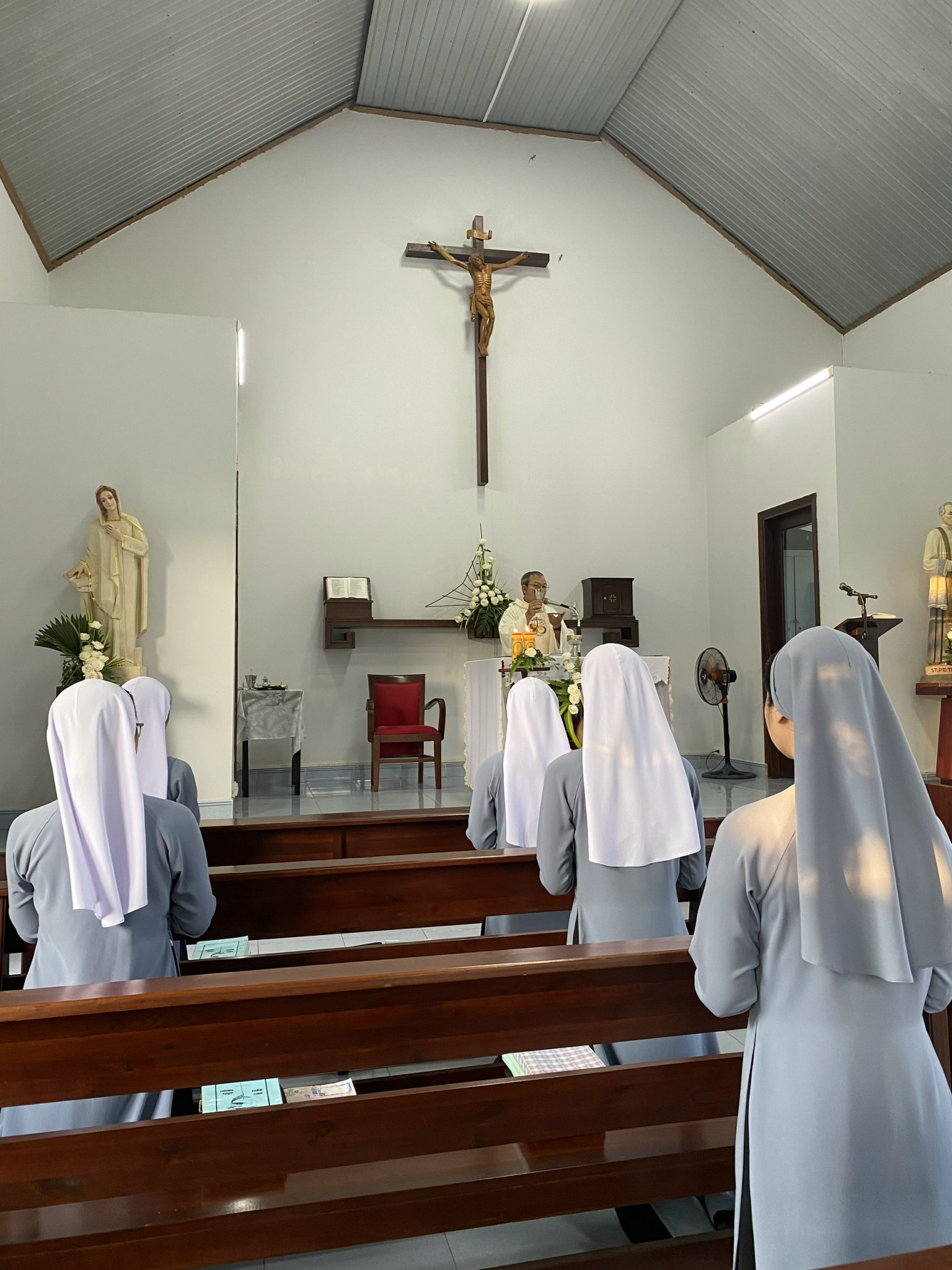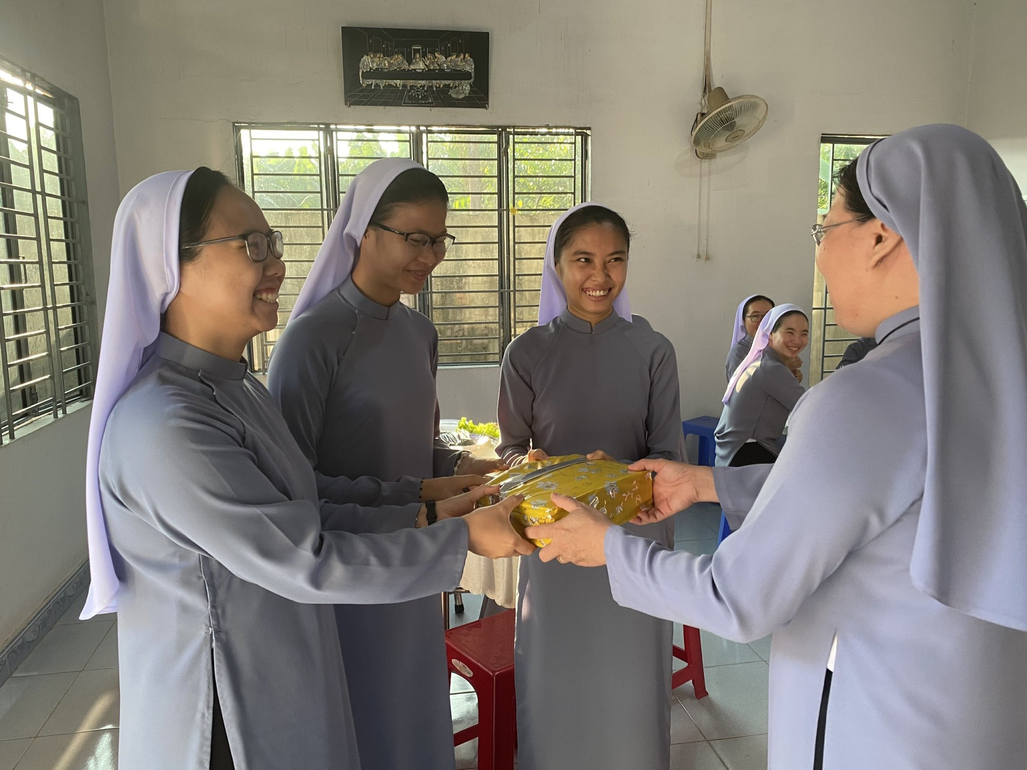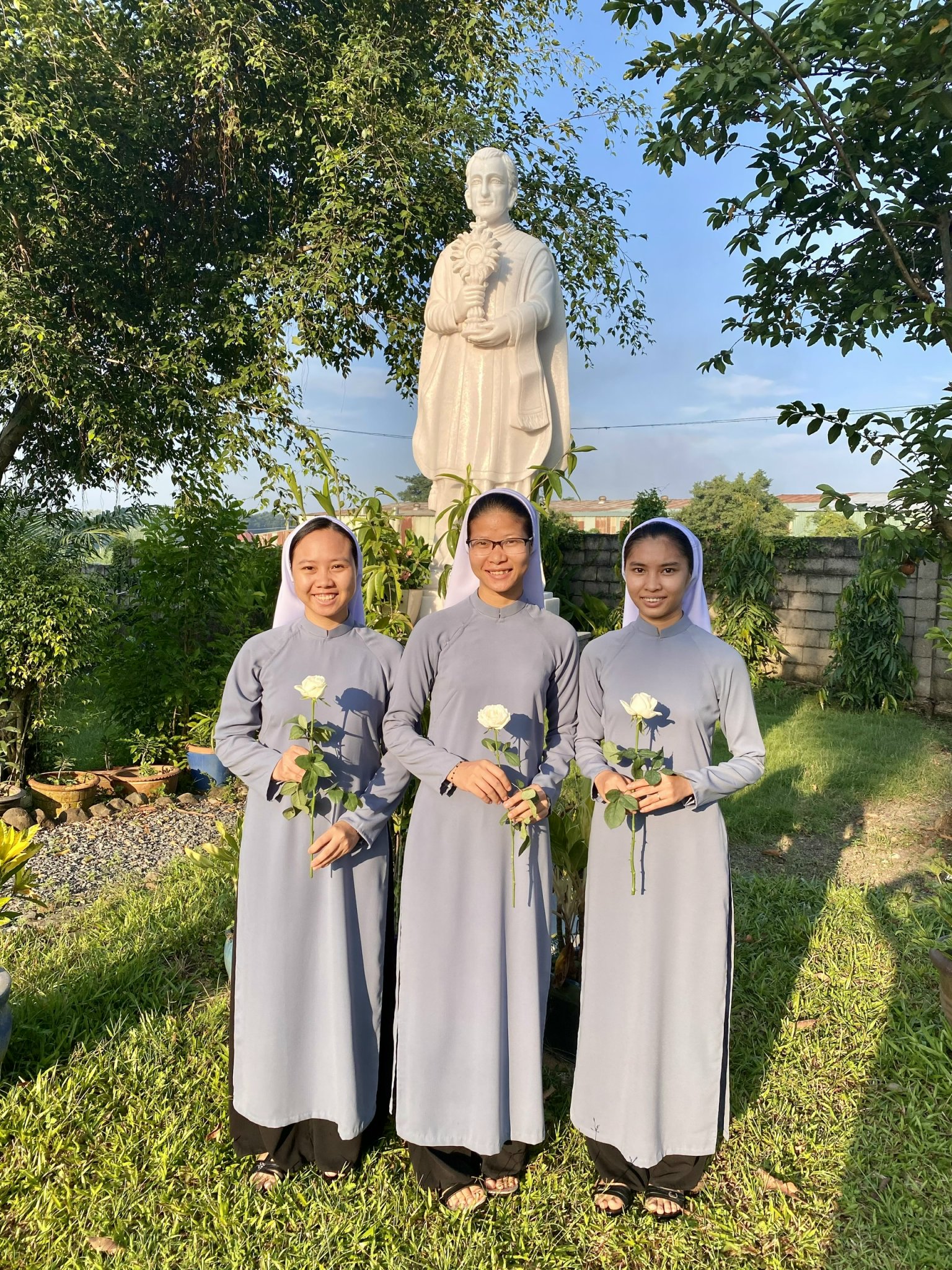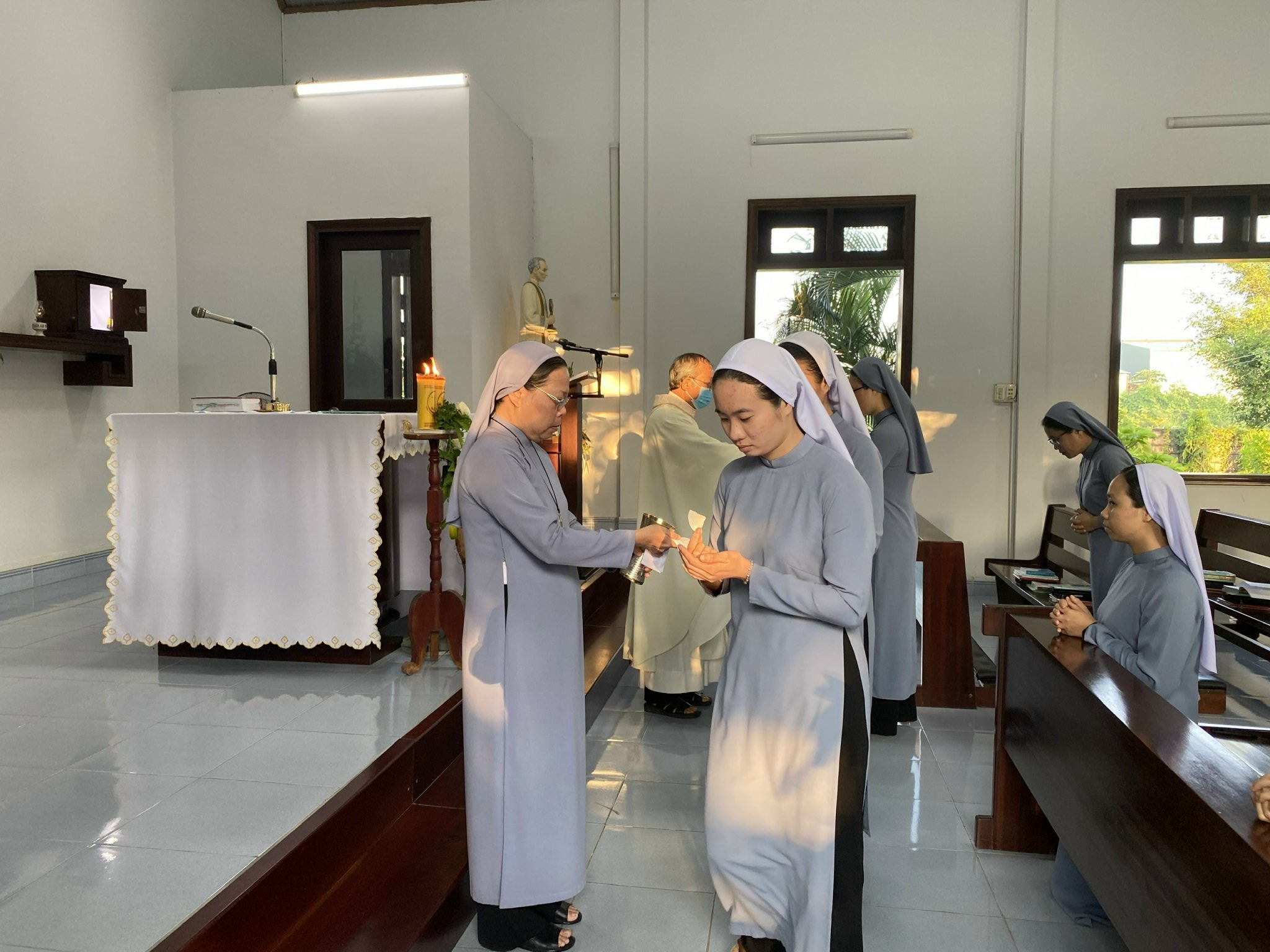 Hôm nay là ngày lễ huy hiệu của Hội Dòng, lễ Mình Máu Thánh Chúa Kitô và đây cũng là ngày đặc biệt của ba chị em chúng con. Ngày chúng con được nhận tu phục, được mặc lấy tâm tình của Thiên Chúa. Và khi chúng con cất cao bài hát “Yêu”, con thấy mình được Chúa yêu thương, Chúa ôm trọn cuộc đời con.