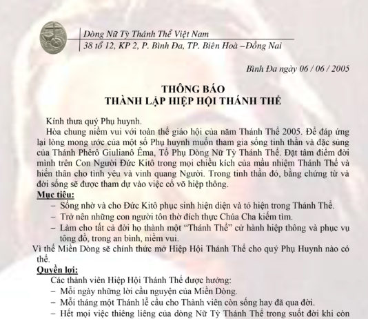 Thư thông báo thành lập Hiệp hội Thánh Thể