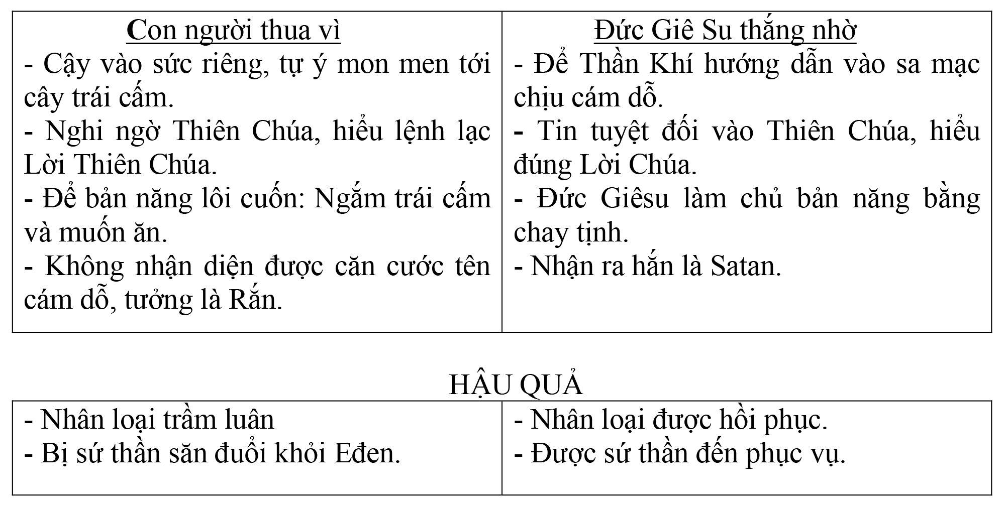 “Được Thần Khí dẫn” lại còn “chay tịnh” trước khi đối đầu với cơn cám dỗ nên Đức Giêsu đã chiến thắng. Còn “Người Nữ” trong bài đọc 1 hành động theo xác thịt; Còn dân Do Thái vừa đặt chân vào sa mạc, đất tự do thì đã liền đòi ngay nước uống ( X. Xh 15, 22-24 ; 17, 2-3 ), đòi ăn ( Xh 16,2-3 ), họ không tin vào Chúa, không tuân thủ luật Người ( Xh, 16, 4b ) nên đã thất bại.