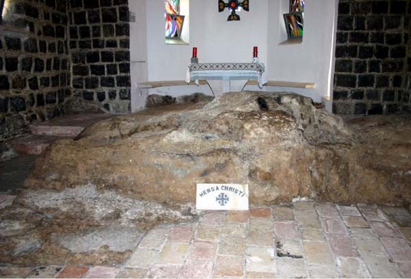 *Tảng đá Chúa nướng cá và bánh cho các tông đồ. (Ga 21,9) trước bàn thờ