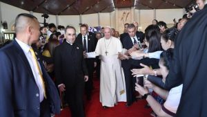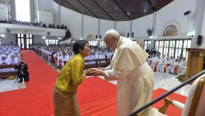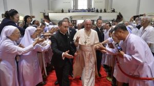 Thứ sáu 22/11/2019, ĐTC Phanxicô bước vào ngày thứ hai trong chuyến tông du lần thứ 32. Hoạt động đầu tiên của ĐTC diễn ra tại Giáo xứ Thánh Phêrô, đối diện với Đền thánh Chân phước Nicolas Bunkerd Kitbamrung, thuộc huyện Sam Phran, tỉnh Nakhon Pathom. Tại đây ĐTC gặp gỡ các linh mục, tu sĩ, chủng sinh và giáo lý viên.