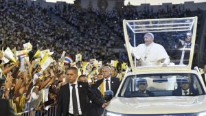 Đông đảo tín hữu đứng hai bên đường gần sân vận động chào đón Đức Thánh Cha khi xe chở ngài đi ngang qua.