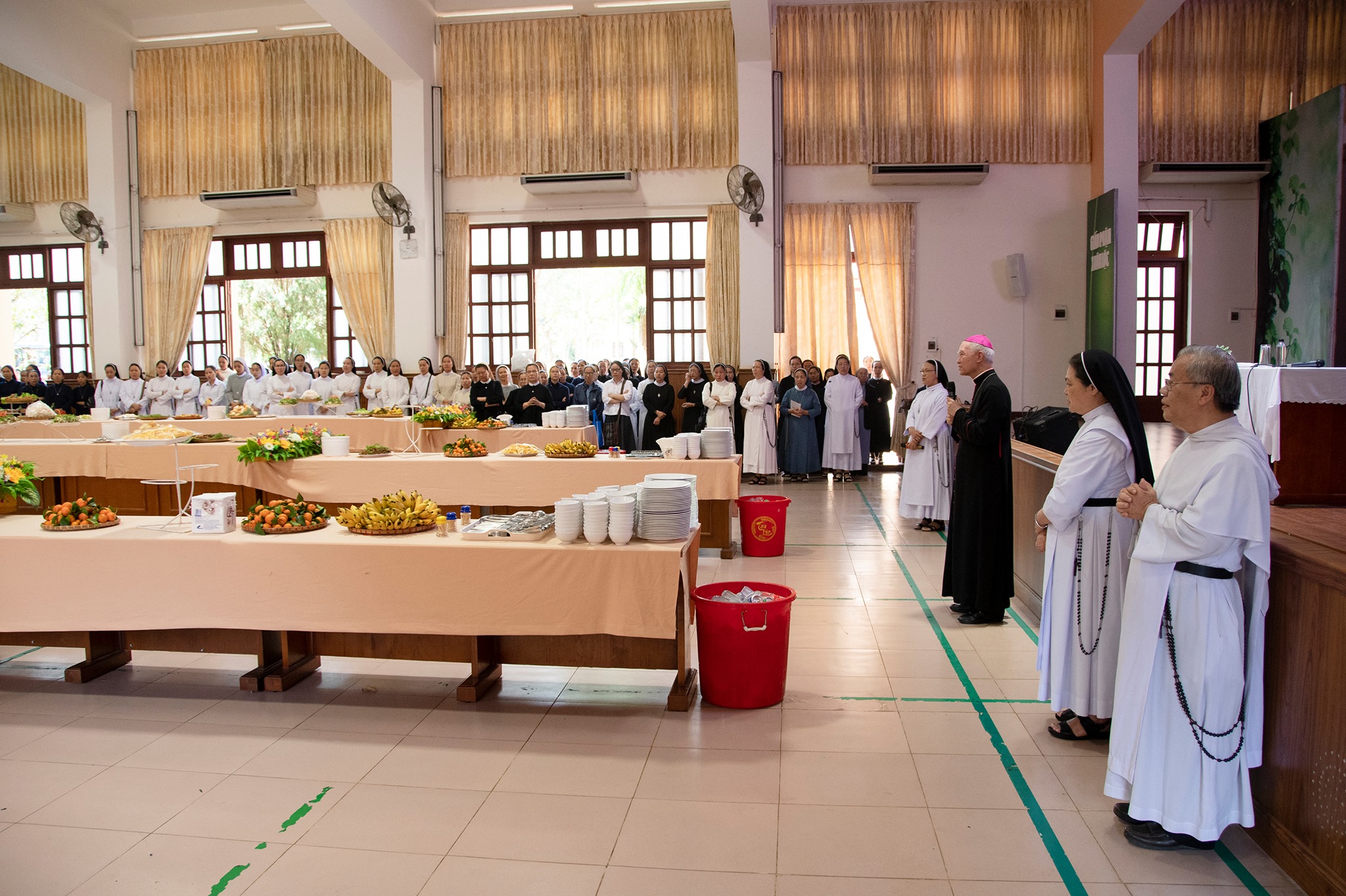 Sau đó, các tu sĩ hân hoan chào đón Đức Cha Giuse – chủ chăn Giáo Phận đến viếng thăm và ban huấn từ. Đức Cha Giuse luôn nhấn mạnh đến Lòng Thương Xót của Chúa biến đổi tất cả và ngài nhắc lại lời Đức Thánh Cha Phanxico: “Sức mạnh sự dữ quá lớn, con người thì quá yếu đuối! Chúng ta chỉ trông chờ vào Lòng Thương Xót của Chúa”. Lời này như một nhắc nhở người tu sĩ có bổn phận cầu nguyện nhiều cho Giáo Hội và cầu nguyện cho con người ngày nay biết ăn năn trở về, đón nhận Lòng Thương xót của Chúa để được cứu độ. Nhưng trước hết, chính tu sĩ phải thấm nhuần ơn thương xót của Chúa trong cuộc đời mình, rồi mới có kinh nghiệm về Chúa để chia sẻ tình yêu đó cho người khác. Kế tiếp Đức Cha Giuse là Đức Cha Gioan, vị Tân Giám Mục Chính tòa Xuân Lộc gặp gỡ đoàn con. Đức Cha nhấn mạnh: “ Chúng ta cần gắn bó với Chúa Giêsu vì Người là Lời của Chúa Cha, là gương mẫu tuyệt hảo mà chúng ta đang cố gắng bước theo qua ba lời khuyên Phúc âm. Nếu tu sĩ mà không sống vâng lời, khó nghèo, khiết tịnh thì sẽ làm xáo trộn cộng đoàn…” Những lời vàng ngọc này đáng để chúng ta lưu tâm và trông cậy vào ơn Chúa gìn giữ từng ơn gọi của chúng ta.