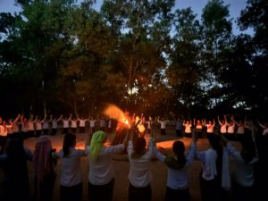 Tiếp theo, Sơ trưởng trại đem lửa đến. Quản trò cho trại sinh ca hát và làm cử điệu “Lửa thiêng ơi…” Sau đó, các đội lần lượt thể hiện các diễn nguyện, ca nhạc kịch xoay quanh Tin Mừng và Linh đạo, sứ mệnh Thánh Thể thật ý nghĩa. Qua các tiểu phẩm, các đội nhắn gởi đến các trại sinh: Trong cuộc đời, có lúc Chúa Giêsu làm như có vẻ đi tiếp, còn chúng ta nhiều khi mệt mỏi chỉ muốn ngồi xuống nhưng Chúa chỉ tay mời chúng ta đi tiếp. Hay khi đi đến vùng ngoại biên chúng ta không có lợi, nhưng để  ta đến với mọi người và để gieo mầm yêu thương. Chúng ta cần đến với mọi nhà và giúp họ mở tung cánh cửa ra, đón tiếp những người nghèo khó và dẫn họ đến với Chúa Giêsu. Có nhiều khi cánh cửa đời ta lúc đóng lúc mở không biết ngày mai thế nào. Nhiều lúc chúng ta quyết theo Chúa đấy nhưng rồi lại bị lôi kéo bởi nhiều thứ xung quanh. Vậy chúng ta cần nguyện theo Chúa, quyết bước theo Chúa Giêsu đến cùng và đi trong niềm vui, tự nguyện đi chứ kg phải ai bảo chúng ta đi. Ta hãy đem ngọn lửa và hơi ấm này vào tim chúng ta. Cầu nguyện xin Chúa giúp chúng ta đi theo Chúa.