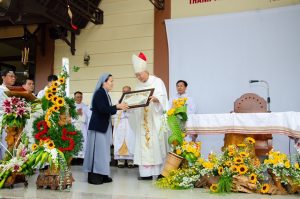 Cha Chưởng Ấn công bố Phép lành Toà Thánh. Đức Cha trao vi bằng phép lành cho chị Phụ trách Cộng đoàn. Cả cộng đoàn phụng vụ hân hoan vỗ tay chúc mừng. Đức Cha ban huấn từ: Cha chúc mừng quý chị trong ngày ngân Khánh cộng đoàn và chúc mừng các chị đã hiện diện tại Giáo phận Kontum…