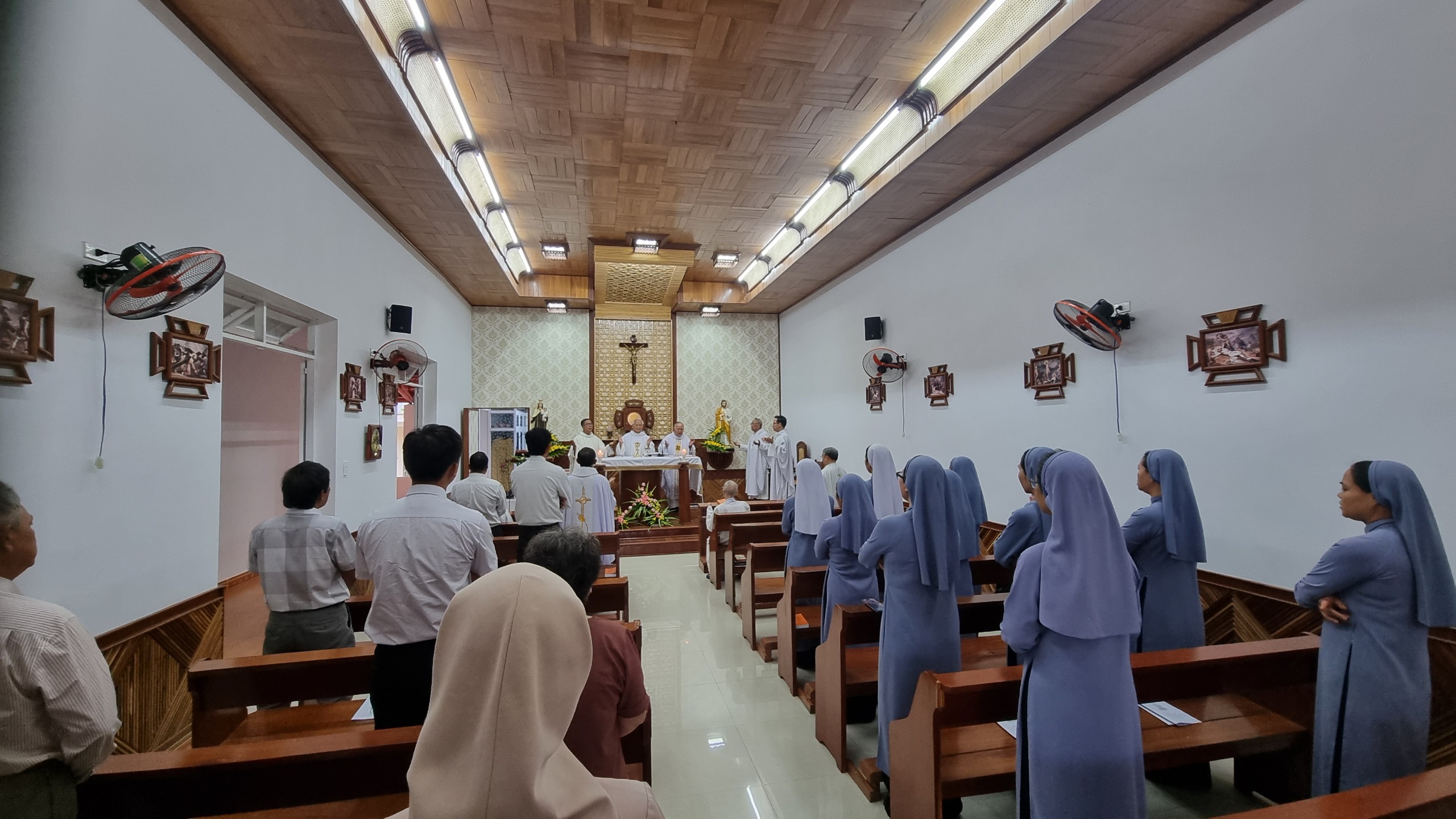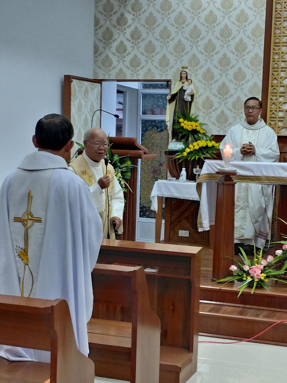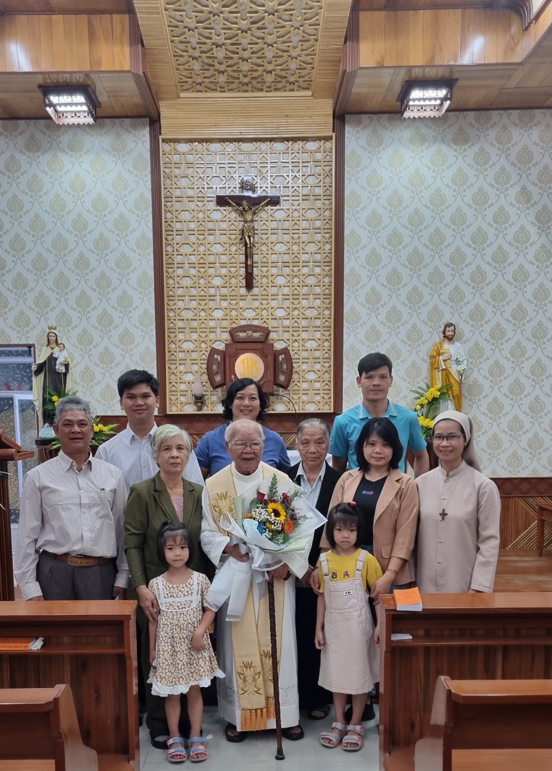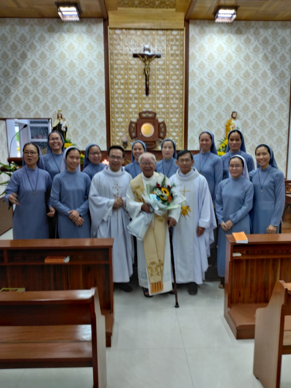 Hôm nay Tỉnh Dòng Nữ Tỳ Thánh Thể Việt Nam cùng tạ ơn Chúa với cha cố Giuse Bùi Đức Vượng về hồng ân 64 năm linh mục, các cộng đoàn trong Tỉnh dòng cùng hướng về nguyện đường nhà hưu của Quý cha Giáo phận Kontum, nơi Cha Cố, Quý Cha và một số chị em đại diện của Tỉnh Dòng cũng như một vài thân nhân của cha cố, cùng hiệp dâng thánh lễ tạ ơn Thiên Chúa đã luôn yêu thương và chăm sóc cha cố, bởi vì cha cố đã chọn Thiên Chúa là Gia Nghiệp như viên ngọc quý và đã dành tất cả những gì quý nhất cho Ngài. Trong bài giảng, cha Đaminh Đinh Quang Vinh, Quản hạt Giáo hạt Pleiku và cũng là cha chánh Giáo xứ Thánh Tâm đã lược lại những điểm nhấn trong cuộc đời ơn gọi của cha cố.