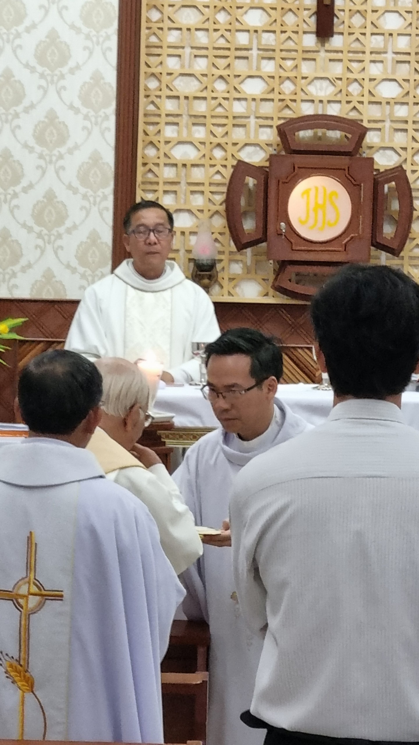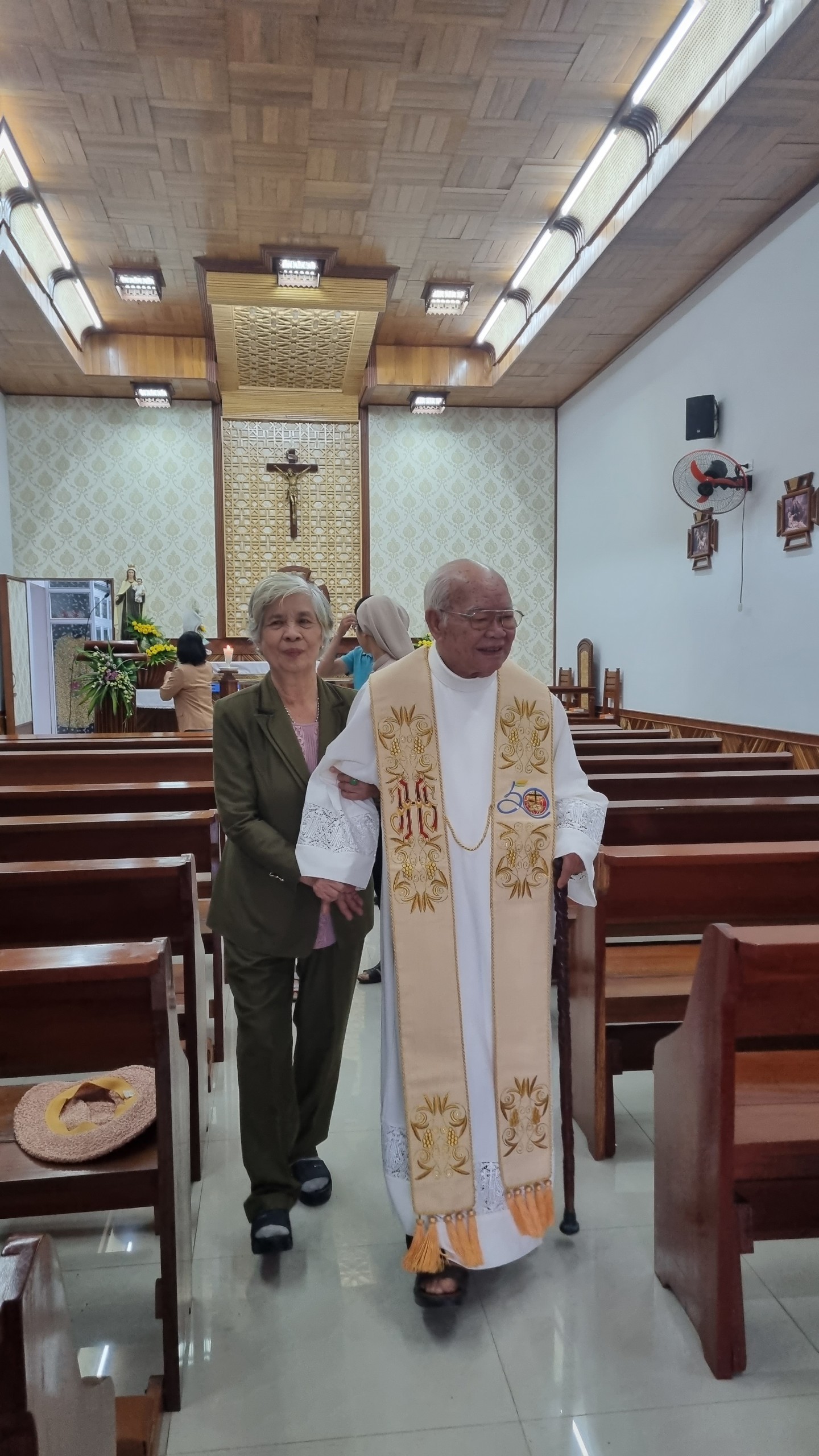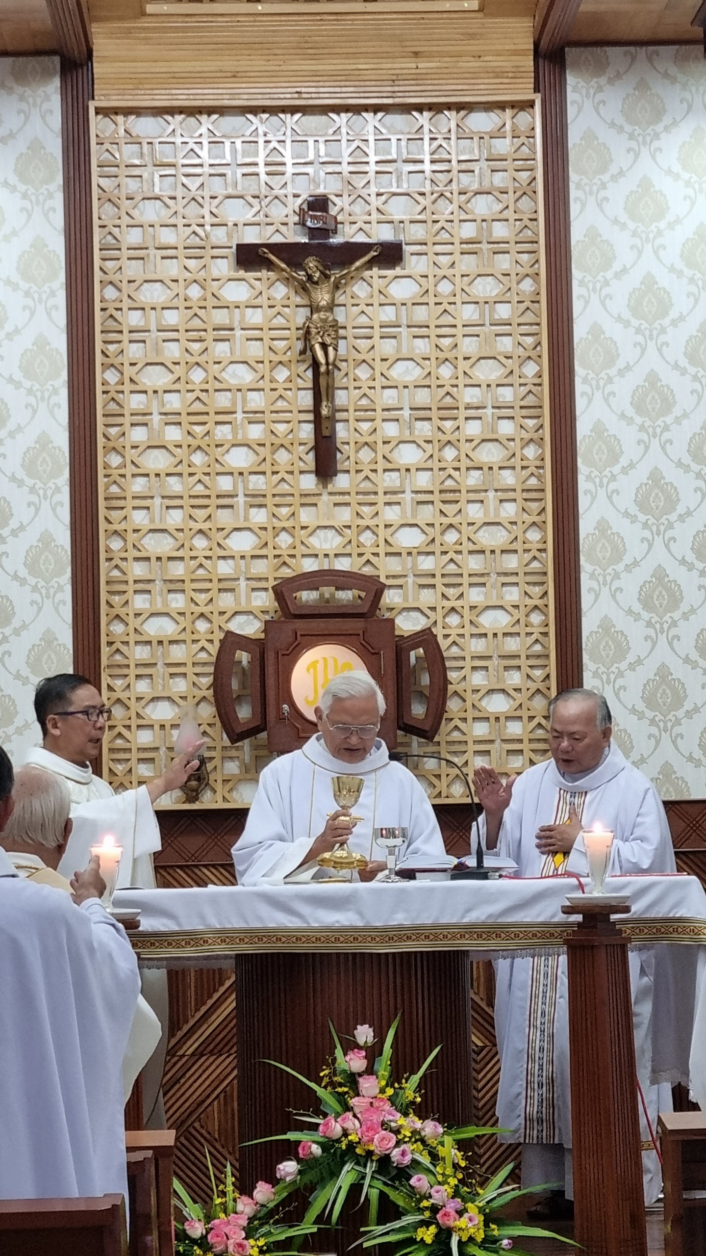 Hôm nay Tỉnh Dòng Nữ Tỳ Thánh Thể Việt Nam cùng tạ ơn Chúa với cha cố Giuse Bùi Đức Vượng về hồng ân 64 năm linh mục, các cộng đoàn trong Tỉnh dòng cùng hướng về nguyện đường nhà hưu của Quý cha Giáo phận Kontum, nơi Cha Cố, Quý Cha và một số chị em đại diện của Tỉnh Dòng cũng như một vài thân nhân của cha cố, cùng hiệp dâng thánh lễ tạ ơn Thiên Chúa đã luôn yêu thương và chăm sóc cha cố, bởi vì cha cố đã chọn Thiên Chúa là Gia Nghiệp như viên ngọc quý và đã dành tất cả những gì quý nhất cho Ngài. Trong bài giảng, cha Đaminh Đinh Quang Vinh, Quản hạt Giáo hạt Pleiku và cũng là cha chánh Giáo xứ Thánh Tâm đã lược lại những điểm nhấn trong cuộc đời ơn gọi của cha cố.