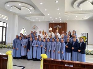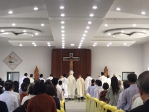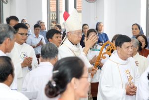 Lời bài hát “Hồng ân Linh Mục” đã du dương dẫn đoàn đồng tế và cộng đoàn tiến vào cung thánh của ngôi nguyện đường Nhà Mục Vụ Giáo Phận Kontum để hiệp dâng Thánh lễ tạ ơn 65 năm Linh Mục của Cha Cố Giuse Bùi Đức Vượng, vào buổi sáng ngày 27/7/2023.