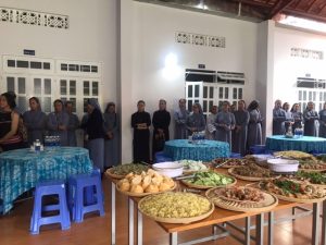 Thánh lễ kết thúc tại nguyện đường nhưng được nối dài trong bàn tiệc Agapé tại nhà hưu. Quý Đức Cha, quý Cha và mọi người đã sum họp quanh bàn tiệc tại nhà hưu dưỡng mà chắc cũng rất hiếm mới có như hôm nay. Mọi người cùng chia sẻ với Cha cố niềm vui tạ ơn, nhưng cũng là dịp rất vui được gặp Cha cố trực tiếp để Cha gọi tên và thăm hỏi trò chuyện cùng.