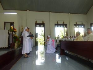 Thánh Lễ được cử hành rất sốt sắng trong bầu khí ấm áp của ngôi nguyện đường Tập Viện nhỏ bé. Tiếng hát du dương của quý sơ đưa mọi người tham dự lễ nâng tâm hồn lên với Chúa. Và trang trọng hơn là nghi thức tuyên khấn. Một mình em quỳ trước cung thánh, thân thưa lên Chúa lời Khấn hứa thật linh thiêng.