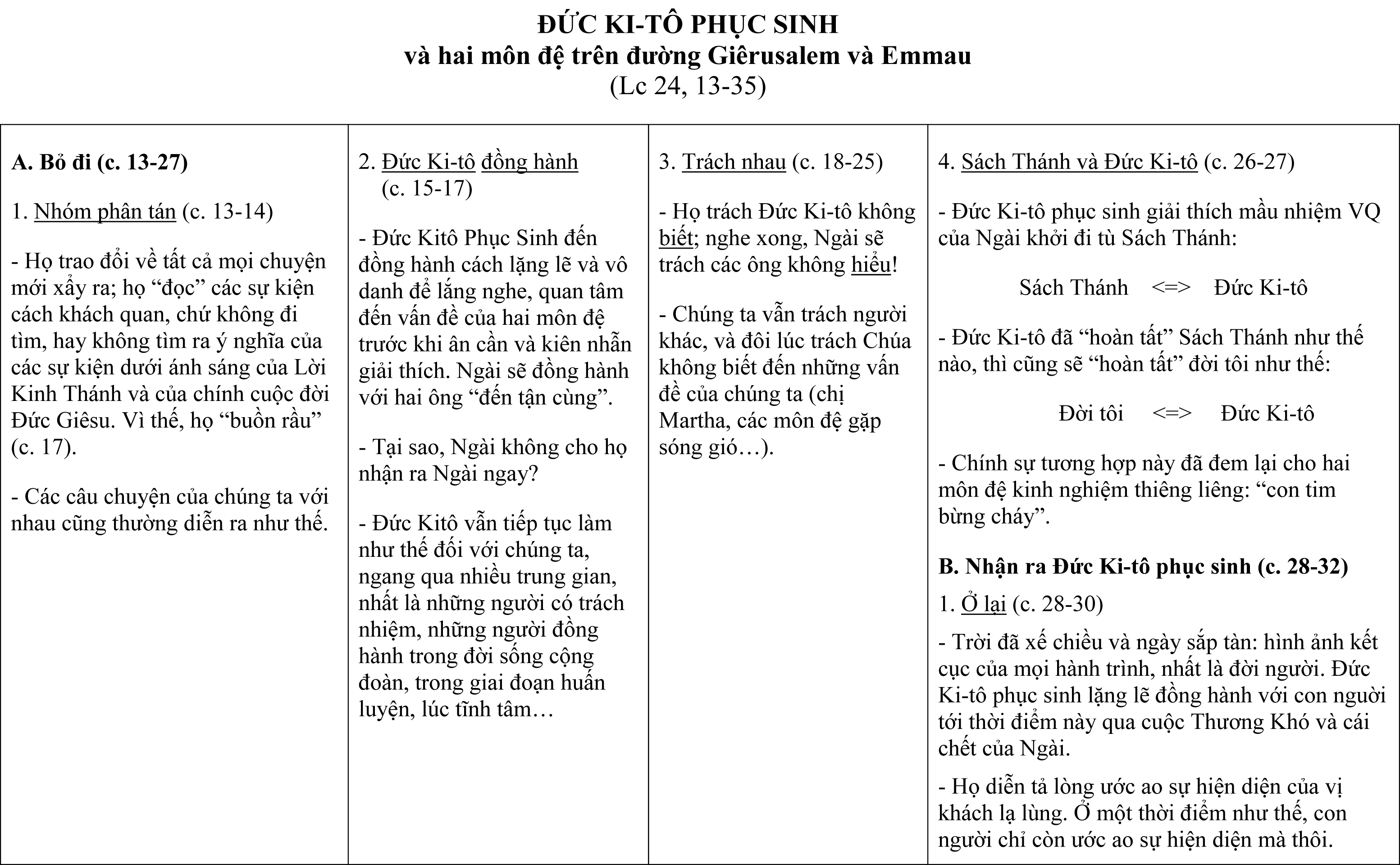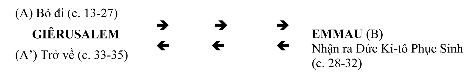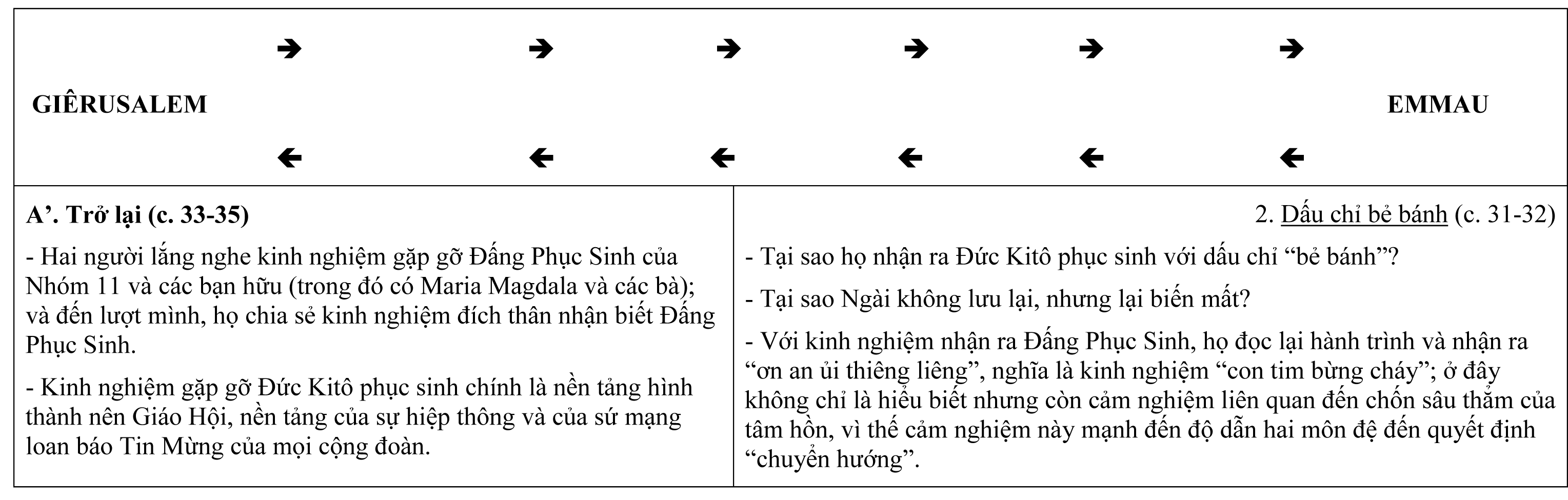 Kinh nghiệm gặp gỡ Đức Ki-tô Phục Sinh của hai môn đệ xẩy ra trên hành trình từ Giê-ru-sa-lem đi Emmau và từ Emmau trở về Giê-ru-sa-lem. Hành trình gồm ba « chặng », xắp xếp theo cấu trúc đối xứng như sau : A (Bỏ đi hay nhóm phân tán), B (Nhận ra Đức Ki-tô phục sinh), A’ (Trở lại hay nhóm tái qui tụ).