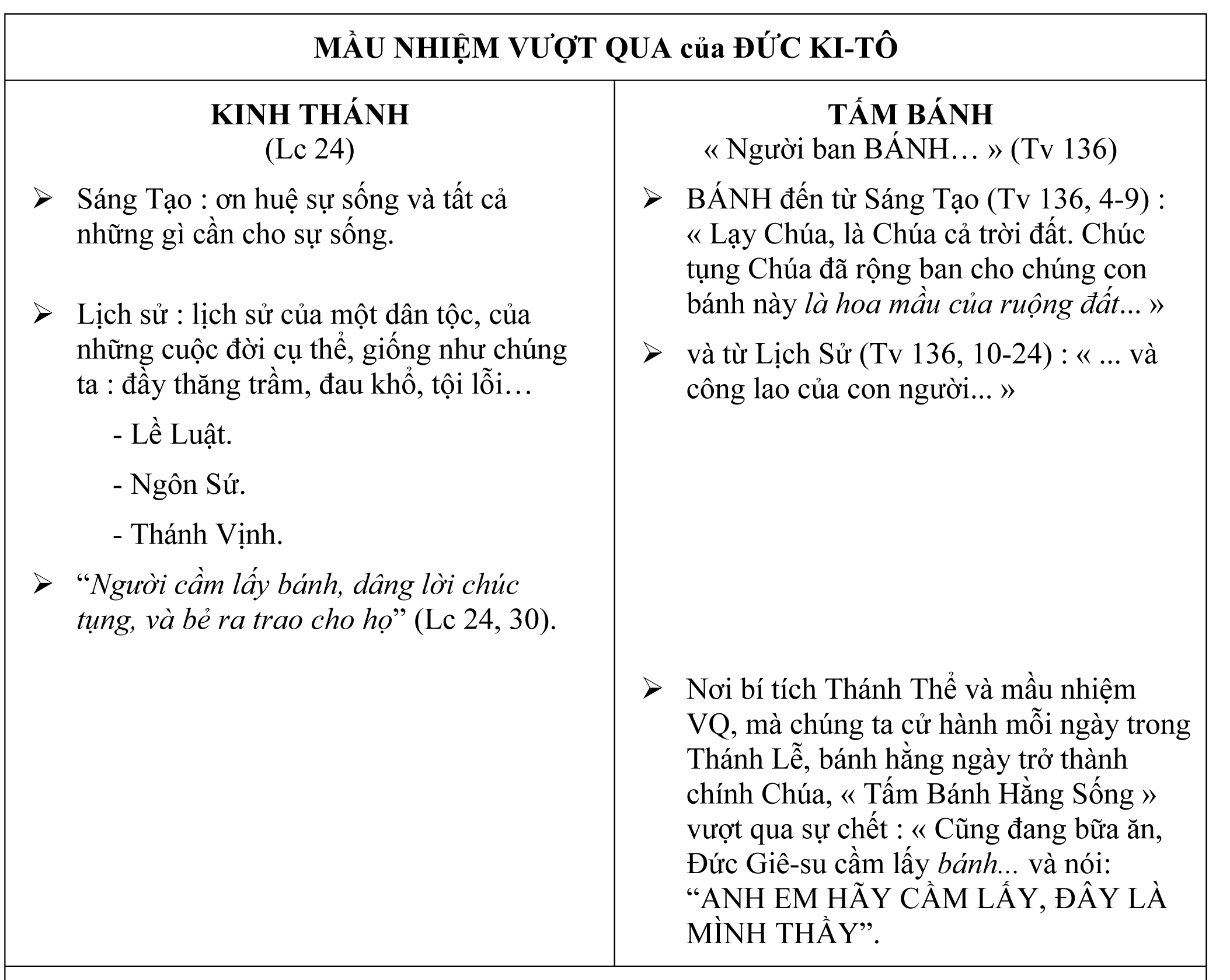 Mầu nhiệm Vượt Qua tương hợp với Kinh Thánh và với Tấm Bánh ; Kinh Thánh tương hợp với Tấm Bánh. Nhận ra những tương hợp này sẽ làm cho « con tim chúng ta bừng cháy » (x. Lc 24, 13-35), vì đụng chạm đến chốn thâm sâu của hữu thể chúng ta (à la profondeur de notre être).
