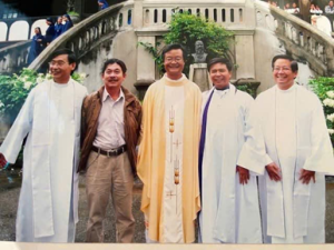 Bok Tâm và tôi đi dọc theo lối xuống, xem lại hàng cây anh đào, lúc xưa Nguyễn Hùng Vị, Trần Văn Bảy và tôi đã trồng, nhưng nay chỉ còn sót lại hai gốc èo ọt. Luống hoa hồng ngày xưa ba chúng tôi chăm sóc, mỗi khi đi dạo trên đồi cù, chúng tôi thường mang theo bao để lượm phân bò, phân ngựa về bón, nay không còn vết tích. Ngày đó cũng có cả anh Trương Trọng Ái, CVK 61, trong nhóm trồng hoa. Anh Ái và tôi cùng làm ông từ coi nhà nguyện, khi nhà nguyện còn ở trong nhà chính, nhà nguyện trên đồi chưa xây. Có lần những luống hồng quanh nhà hết hoa, anh Ái đã mang theo sécateur xuống bùng binh dưới chân đồi, bên bờ hồ Xuân Hương, định cắt hoa ở bùng binh đem về chưng nhà nguyện, nhưng anh chưa kịp cắt thì đã bị cảnh sát đi tuần đêm, giờ giới nghiêm, xét hỏi. Anh không có mảnh giấy nào lận lưng, lại cầm theo hung khí là sécateur, nên anh đã bị đưa về đồn cảnh sát, giam một đêm.