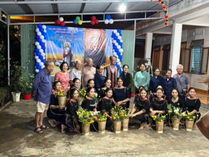 Buổi tối đoàn được yă mẹ và các yă mời dùng cơm tại cộng đoàn Kon Rờ Bàng. Đây là một cộng đoàn lớn có nhà đệ tử, nhà thăng tiến ( nhà dạy may cho các em) và nhà nội trú. Các yă làm một poster rất lớn chào mừng cha Nguyễn Ngọc Tâm, chủ tịch KMF. Bữa tối có hai hũ rượu cần lớn và các món đặc sản Tây Nguyên. Có cả cồng chiêng, đàn đá, các nhạc cụ và các vũ điệu Tây Nguyên. Cuộc tiếp đón đầy đủ, trang trọng và hoàn chỉnh, ngoài nghĩ tưởng của chúng tôi. Nhìn giới trẻ linh hoạt, vui vẻ và khéo léo, nhanh nhẹn, chúng tôi thầm cảm ơn Thiên Chúa cho tương lai của hội dòng Ảnh Phép Lạ.