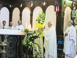 Sau đó một giáo dân đại diện Giáo phận lên tặng bó hoa chúc mừng cha Giuse