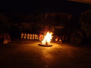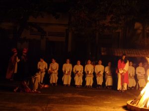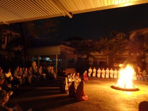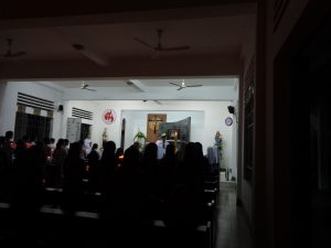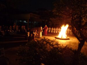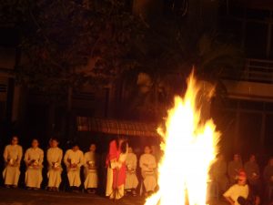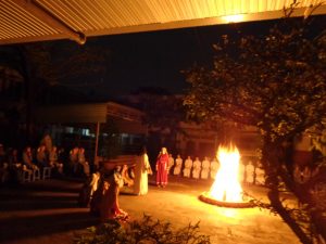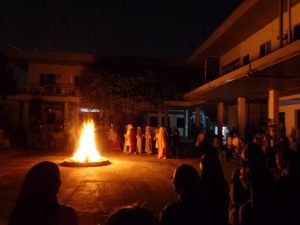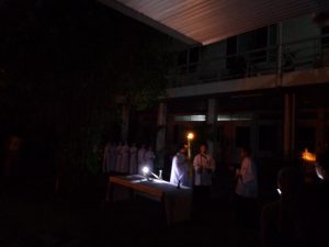 Tối nay Thứ Bảy Tuần Thánh, theo như thông lệ thường. Cộng đoàn Nữ tỳ Thánh Thể Nhà chính vẫn đốt lửa và quây quần bên đống lửa để kể cho nhau nghe. Nhưng năm nay không có phần kể cho nhau nghe, bù lại là phần diễn nguyện với chủ đề “Gương mặt Phêrô”. Nội dung được diển tả từ ngày đầu tiên Chúa gọi Phêrô, ba năm Phêrô theo Chúa từ phép là chữa bệnh cho dân chúng tới vườn dầu, tới dinh Cai-pha. Tại đây Phêrô đã chối Chúa ba lần. Rồi Cái nhìn của Chúa đã khiến Phêrô hối hận khóc lóc… Và khi Chúa sống lại Người đã hỏi Phêrô ba lần “Con có mến thầy không?” Và Phêrô cũng đã kiên nhẫn trả lời ba lần “Thầy biết con mến thầy”.