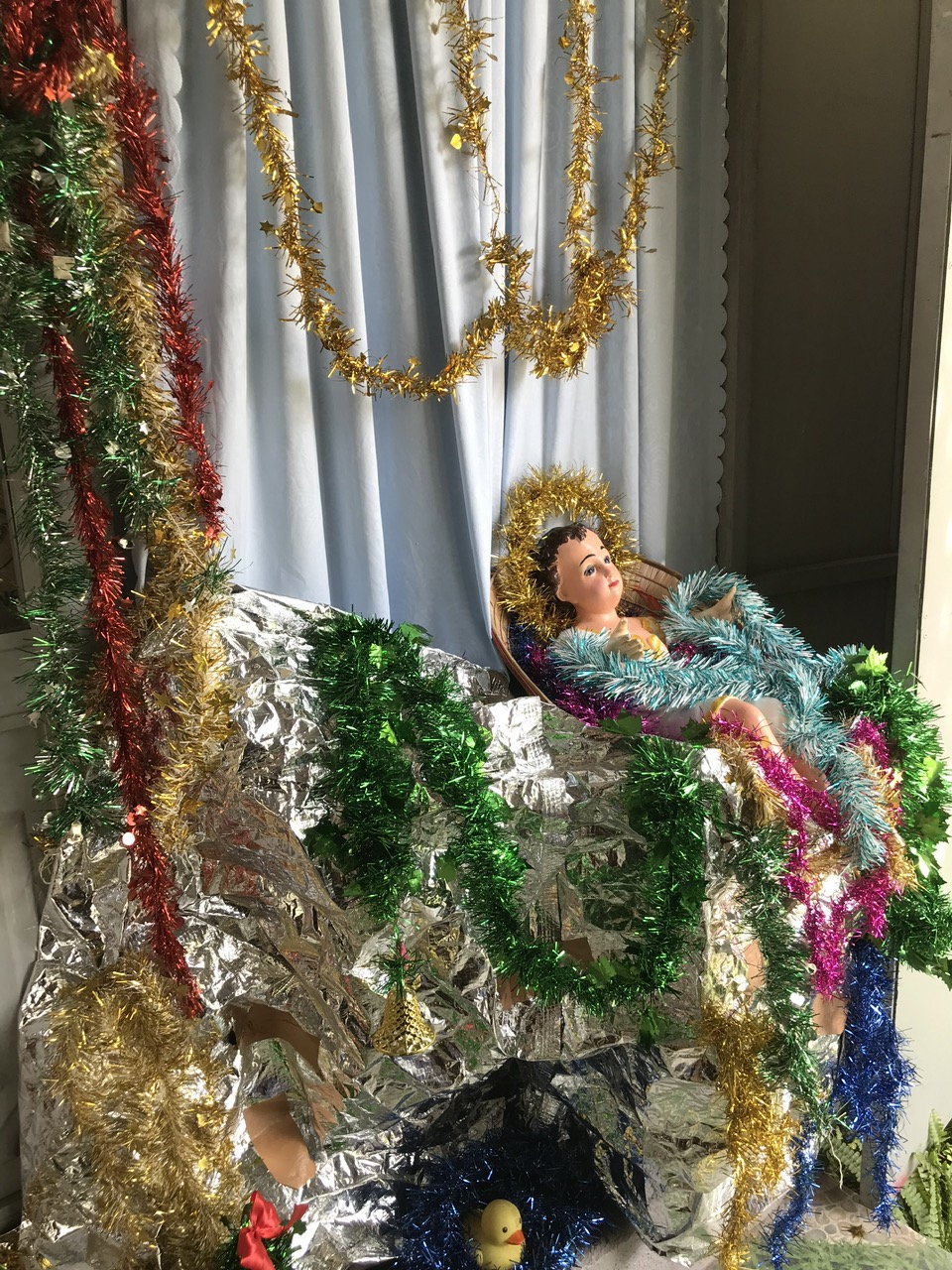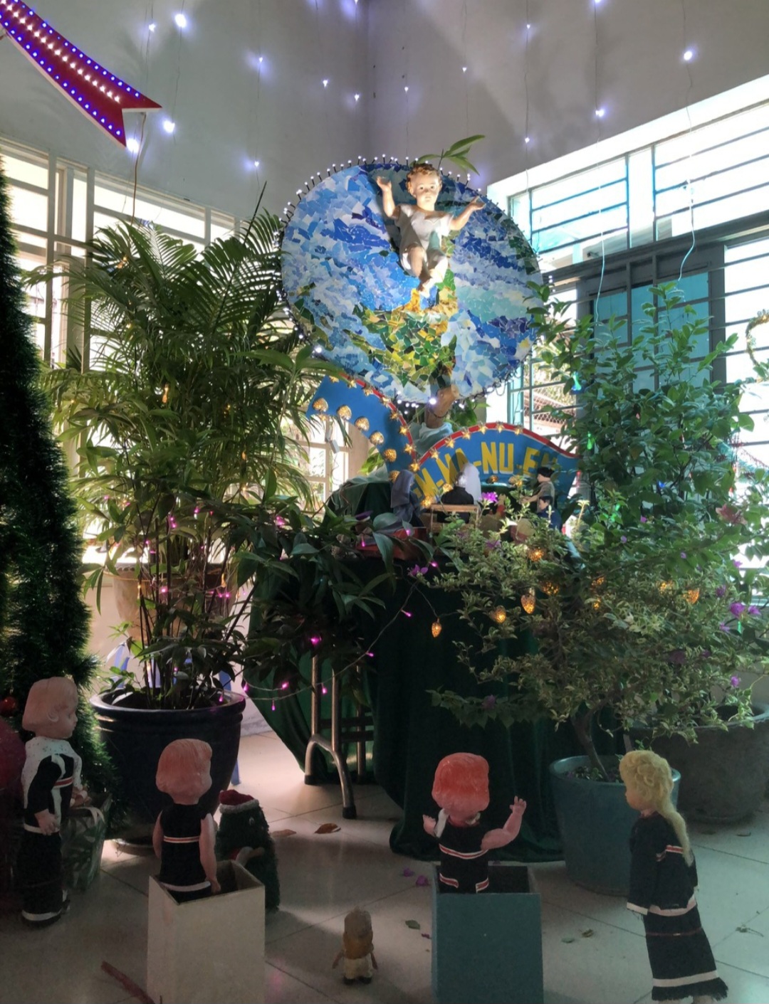 Như tượng Chúa Hài Đồng trong hang đá của em đây. Theo thời gian mầu sơn đã bạc…, một “nghệ nhân “ nhà ta đã muốn tạo cho Chúa một vẻ đẹp mỹ miều hơn… Thật là tai hại ! Với bộ dạng mới mẻ này Chúa đã “bị “ đặt cho cái tên là Chúa Hài Đồng K.T. Trông hay lắm ! Mầu da thì đỏ đắn như người Gia-Nã Đại, hai cánh tay chưa kịp tô thì mầu da như người Mỹ trắng… Thôi thì cũng được ! Vì Chúa yêu toàn thể nhân loại mà ! Còn khuôn mặt Chúa ? Trông kỳ quá à ! Chắc chắn là không thể chưng vào hang đá được rồi. Thế là Chúa bị loại khỏi vòng đầu… Và nhờ đó em được đón Chúa về khu bảo vệ của nhà dòng.