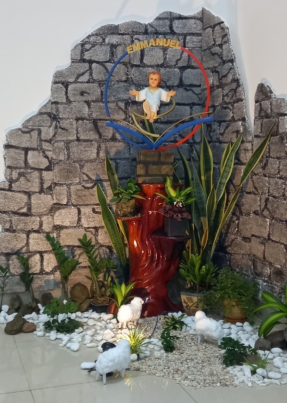Emmanuel cũng chính là chủ đề cho Hang đá nhà ăn của Cộng đoàn nhà mẹ. Thượng hội đồng giám mục lần thứ 16 vừa khép lại và cũng là lúc đưa vào hiệp hành, năm nay Giáo hội hiệp hành nhờ Lời Chúa và Thánh Thể. Hang đá phòng ăn em cũng lấy ý từ chủ đề đó. Lời Chúa khi được đọc dưới ánh sáng của Chúa Thánh Thần và đọc với cả con tim, thì Lời Chúa sẽ luôn là đèn soi cho ta bước và ánh sáng chỉ đường chúng ta đi (Tv118, 105). Thánh Thể là trung tâm và chóp đỉnh của Giáo Hội và của mỗi người Ki tô hữu, đặc biệt với Nữ Tỳ Thánh Thể là nguồn sống và nguồn suối ân sủng cho chúng ta. Khi hiệp lễ ta được nên một với Ngài và ở mãi mãi với Ngài, mở lòng ra để tiếp lấy tình yêu của Chúa, mà trao tặng tình yêu ấy cho nhau bằng cách trao bình an, hạnh phúc, hy sinh cho tha nhân. “Ngôi Lời đã trở nên người phàm và cư ngụ giữa chúng ta.” (Ga 1,14)