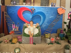 Chúng con cũng nhìn lên Giáo Hội với chủ đề mục vụ 2021: Gia đình hãy trở nên mái ấm của Lòng Thương Xót – Đồng hành với người trẻ trong đời sống gia đình. Vì thế, Thiên Chúa cũng trao món quà Giêsu đến cho từng nhà, từng cá nhân  từng gia đình, cộng đoàn, để khi gia đình, nhất là gia đình những người trẻ biết mở lòng ra đón Chúa, thì cũng là lúc ánh sáng nơi trái tim đầy Lòng Thương Xót của chúa sẽ dọi chiếu trên họ. Trái tim được gắn ôm trọn lấy hộp quà không chỉ làm tỏa rạng ánh sáng Lòng Thương Xót của Chúa Hài Đồng, mà còn bật lên lòng Cha thương Con Một của mình, sâu xa hơn là cả nhân loại. Chính vì lẽ đó, chỉ những gia đình, cộng đoàn  biết mở hộp quà ra, biết đón nhận Chúa Giêsu mới được Người Xót Thương mà dẫn dắt họ đi trên chiếc thang hướng về Quê Trời.
