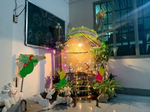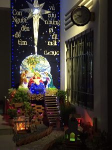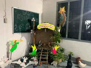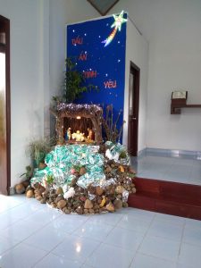 Hòa chung niềm vui của Giáo Hội trong ngày Đại Lễ Mừng Chúa Giáng Sinh sắp đến. Lớp dự tu chúng con cũng dựng nên một hang đá nhỏ cho Chúa Hài Đồng . Hang đá chúng con được dựng nên từ những vật liệu rất đơn sơ, mộc mạc từ những vật liệu có sẵn trong cộng đoàn, đó là : mái nhà được làm từ tre nứa cũ, những cây củi khô, thùng giấy và một vài cục đá dùng để chống đỡ ngôi nhà, và một vài chậu cây xanh từ bàn tay nhỏ bé của chúng con ươm trồng, một vài ánh đèn làm cho hang đá thêm phần lấp lánh. Với chủ đề :