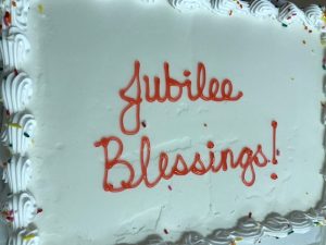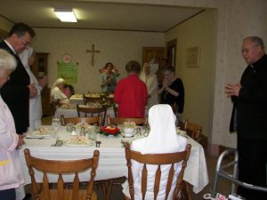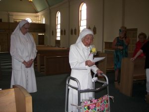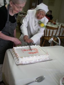 Đúng 10 giờ, Sơ có mặt tại cộng đoàn, bước vào trong nhà với hai giòng lệ. Sơ Thư ký cài hoa trên ngực và nét vui tươi hiện lên khuôn mặt khi Sơ Bề trên đến chúc mừng. Thánh lễ lúc 11 giờ, tuy ít người nhưng rất thiêng liêng và sốt sắng. Trong Thánh Lễ, Sơ lặp lại Lời khấn cách xác tín. Sau Lễ, Sơ cùng toàn thể mọi người chia sẻ niềm vui với bữa ăn thân mật vỏn vẹn 3 mâm. Tiệc mừng này đa phần là những món ăn mà Sơ thích (chắc chắn không thể thiếu cơm), tráng miệng cũng rất đặc biệt “Bánh kem” (bánh làm bằng ice-cream). Cộng đoàn đã dành cho Sơ những gì là tốt nhất có thể và mong ước Sơ cảm thấy niềm vui và hạnh phúc. Điều đó đã thể hiện qua nụ cười luôn có trên khuôn mặt Sơ. Sau bữa tiệc lúc 13g30, AC (cho Sơ rước lễ) đưa Sơ về. Dù đã ngồi vào xe, không biết Sơ nghĩ gì, Sơ nói cho Sơ ra thăm mộ các Sơ…..