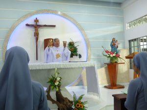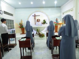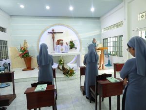 Chính ngày lễ, Chị em cùng tôn thờ Chúa trong giờ Chầu Thánh Thể và cử hành giờ Kinh Phụng Vụ trọng thể trong tâm tình tôn vinh Chúa cùng với Đấng Sáng Lập Hội Dòng. Và đúng 10g ngày 01/8, Thánh Lễ mừng kính Thánh Phêrô Giulianô Eymard đã được Cha Vinh Sơn Nguyễn Tiến Dũng – Chánh xứ Tân Bình cử hành long trọng. Tất cả chị em trong cộng đoàn đã sốt sắng tham dự, có sự hiện diện của một Tập sinh Tu hội Chúa Kitô và một Ứng sinh của Giáo phận Xuân Lộc.