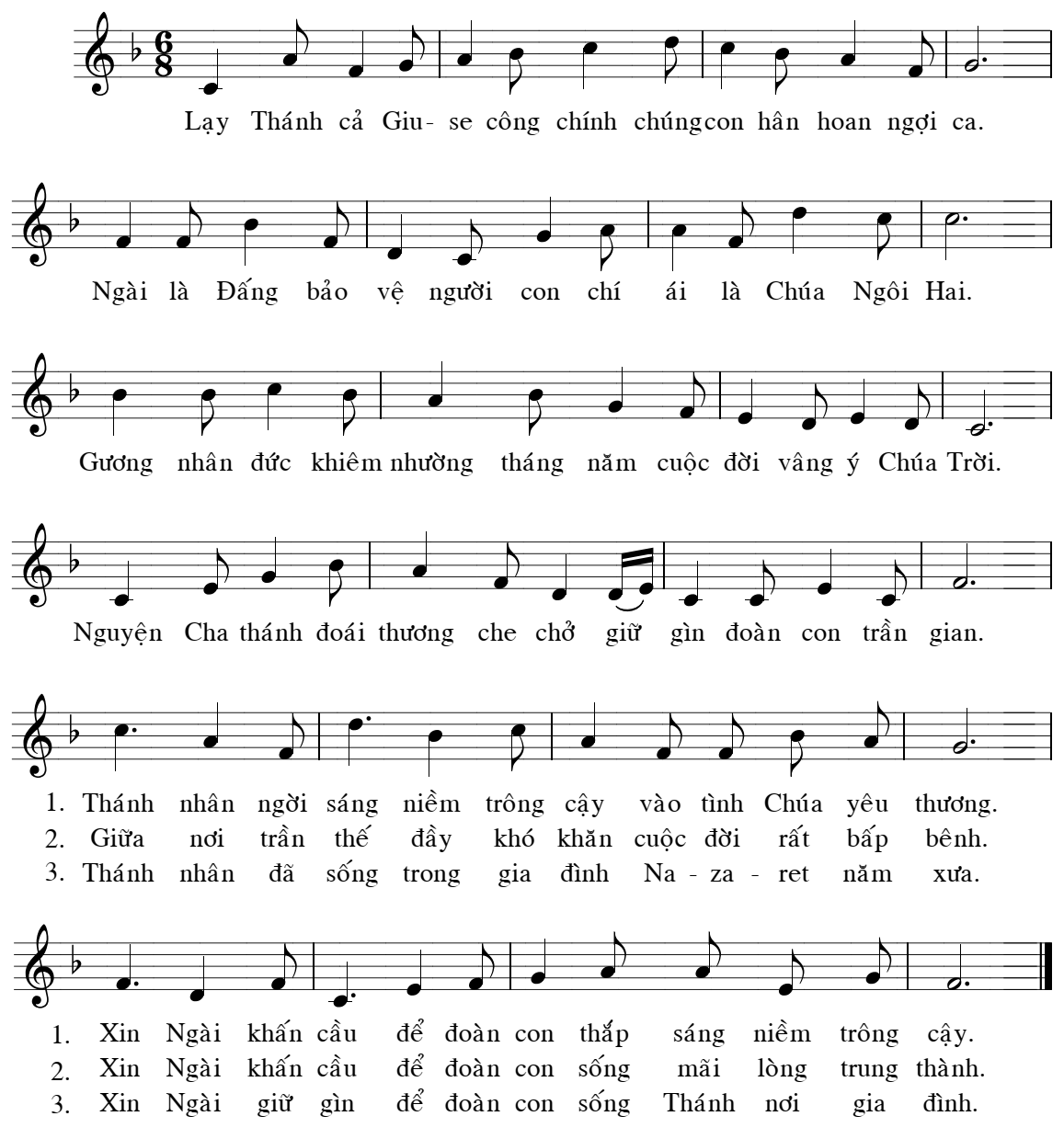 Lạy Thánh Cả Giuse, Ngài là bạn trăm năm đức trinh nữ Maria, là cha nuôi Đấng Cứu Thế, Cha Thánh đã chu toàn sứ vụ Chúa trao phó cho Ngài thật hoàn hảo. Sống mến Chúa yêu người. Chúng con hết lòng yêu mến, tôn kính Ngài, cùng với Ngài chúc vinh cảm tạ Thiên Chúa.