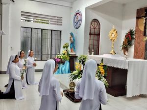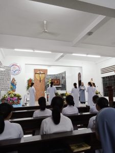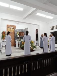Trong bầu khí ấm cúng và linh thiêng tại nguyện đường cộng đoàn Nhà Mẹ, tất cả các chị em trong cộng đoàn và cả các em Dự Tu từ cộng đoàn Bình Hải cũng qua để hiệp thông với các chị của mình trong ngày trọng đại này. Lời kinh xin ơn Chúa Thánh Thần đã đưa tâm hồn mọi người hướng về Thiên Chúa để cầu nguyện cho lễ dâng đầu đời của các em.