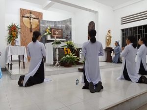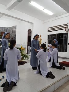 Với niềm xác tín ấy, trước giờ Kinh Sáng ngày 20 tháng 5 là ngày Giáo Hội mừng kính Mẹ Maria, Mẹ Giáo Hội, năm em Dự Tu thuộc tỉnh dòng Nữ Tỳ Thánh Thể Việt Nam đã gia nhập Thỉnh viện. Đây là một bước tiến quan trọng đối với các em. Từ hôm nay, cac em chính thức bước vào giai đoạn huấn luyện trong ơn gọi Nữ Tỳ Thánh Thể.