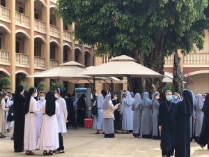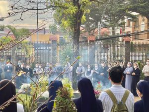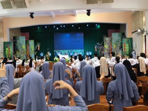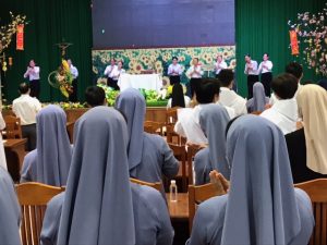 Thứ Hai ngày 17/01/2022, từ sáng các Hội Dòng đã khởi hành và có mặt rất sớm để chuẩn bị cho ngày họp mặt tại Tòa Giám Mục Xuân Lộc. Đúng 7g45, tất cả quy tụ bên cạnh phần mộ của quý cố Giám Mục để dâng hương và cầu nguyện cho các Ngài. Sau đó trở lại hội trường và khởi đầu giờ gặp gỡ. Như các Cộng đoàn khác, Tỉnh Dòng Nữ Tỳ Thánh Thể năm nay cũng có công tác giúp vui trong phần khởi động đầu chương trình. Các chị em trẻ phụ trách mục này trong tinh thần hăng hái với vũ điệu bài “Xuân An Bình” vui tươi và thật ý nghĩa cho buổi Tất niên và cũng là mừng Xuân Mới Quý Đức Cha, quý Cha và Tu sĩ.
