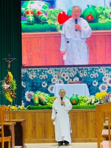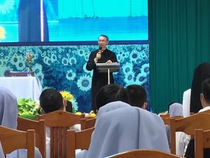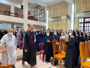 Tiếp theo, Cha Tổng Đại Diện Đaminh chia sẻ với anh chị em Tu sĩ một số thông tin về xã hội và Giáo hội hoàn cầu, con số tín hữu Công giáo và Linh mục, Tu sĩ tăng ở Châu Á nhưng lại giảm ở Châu Âu. Cha cũng cho biết về Giáo Hội Pháp, Đức và con đường công nghị của Giáo hội này. Cha còn chú trọng về Thượng Hội Đồng Giám mục Thế giới (THĐGMTG), hướng tới Hội Thánh Hiệp hành -“Cùng đi với nhau” và mời gọi các Dòng Tu, Giáo xứ chọn chủ đề tĩnh tâm theo chủ đề của THĐGMTG và tích cực học hỏi. Đồng thời Cha muốn khơi lên những vấn đề trong Giáo hội để mong quý Cha và quý Tu sĩ đồng hành với Giáo phận, cộng tác và thi hành những việc mục vụ để xây dựng Giáo phận ngày một tiến triển hơn.