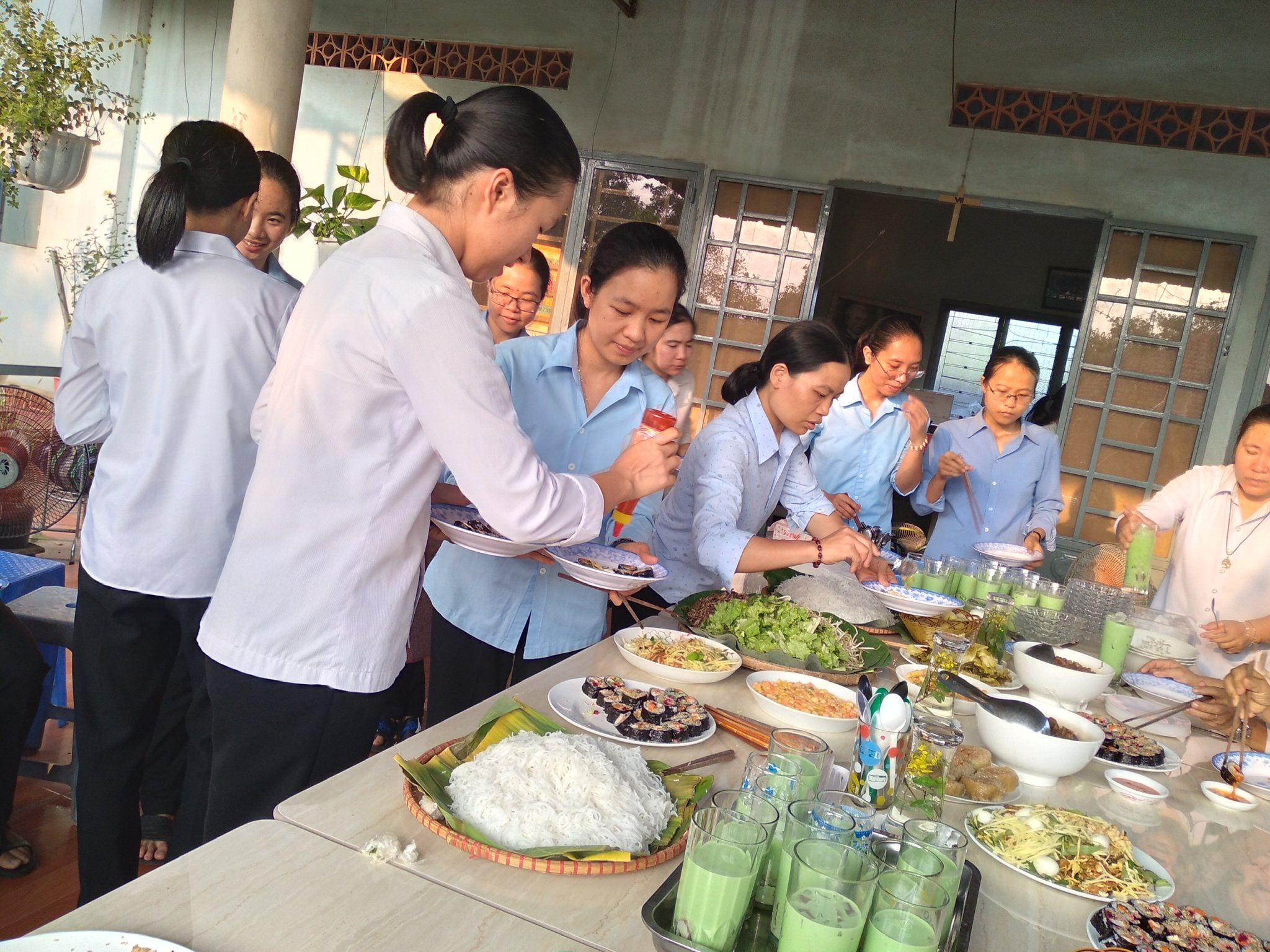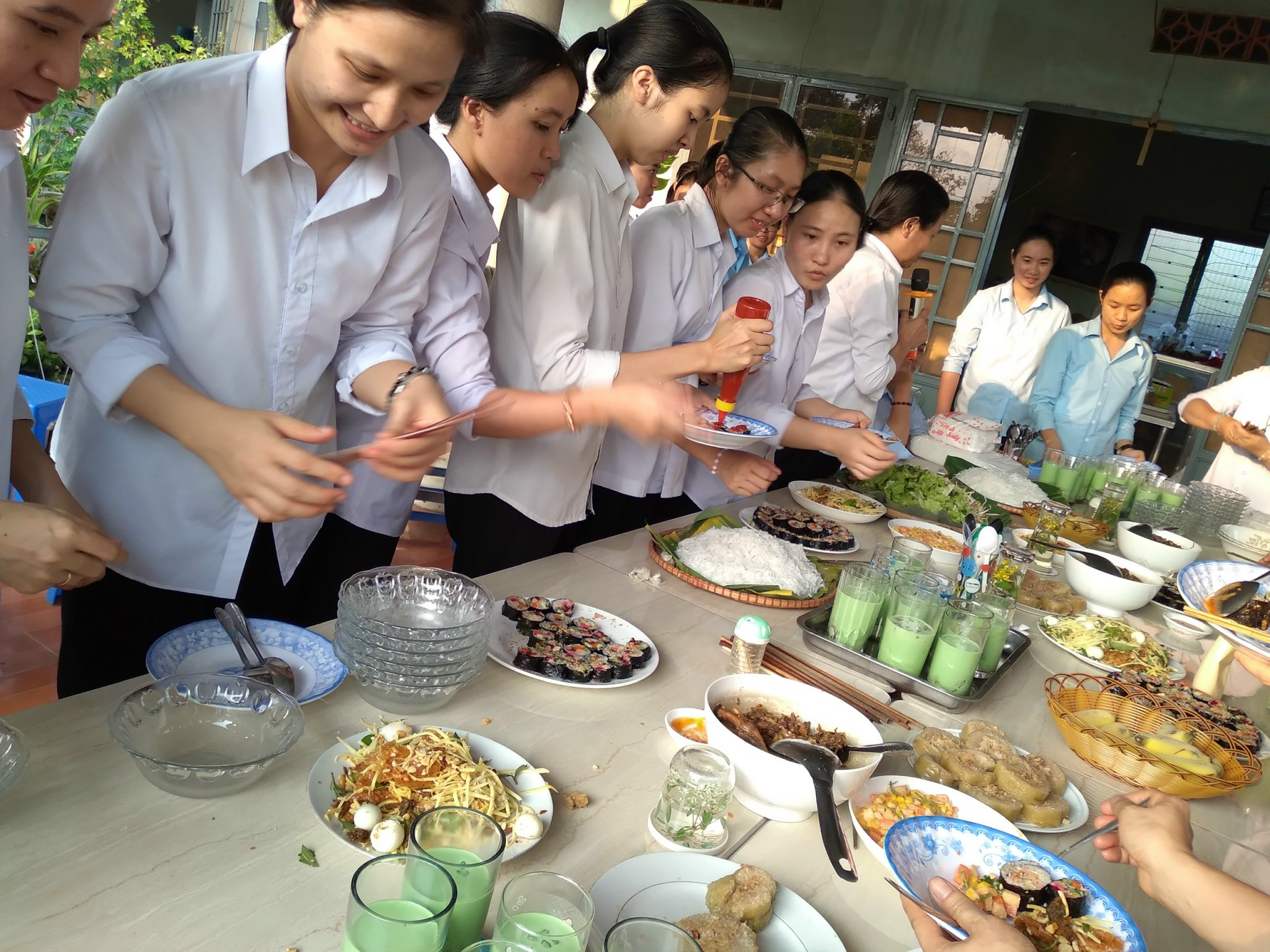 Để tiếp đón quý Dì và các chị đến mừng lễ, chúng con đã tự tay gói bánh tét, làm cơm cuộn Hàn Quốc, vịt xiêm giả cày, bún riêu cua, trà sữa kim cương… thật thơm ngon và hấp dẫn với xuất sứ cây nhà lá vườn đượm tình yêu gia đình Thánh Thể.