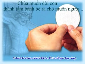 Khi đến xum họp quanh bàn tiệc Thánh Thể, chúng ta cũng hãy cầm lấy tấm bánh cuộc đời nhỏ bé, bất toàn của ta, cùng với những vất vả, đau khổ, niềm vui nỗi buồn… để dâng lên Chúa trong dĩa Thánh, chúc tụng, tạ ơn Chúa đã xót thương ta, nâng đỡ ta trong từng ngày sống và nuôi dưỡng ta bằng chính Thịt Máu Người. Với sức mạnh và sự trợ giúp của Chúa, chúng ta cũng hãy làm cho đời mình trở thành tấm bánh, can đảm bẻ ra trong tha thứ, tôn trọng tha nhân dù họ có khác biệt, sai lỗi hay xúc phạm đến ta; bẻ ra trong hy sinh đón nhận những hiểu lầm, oan ức… để cố gắng sống hiệp nhất, yêu thương. Bẻ ra sẽ đau, sẽ thiệt và rất khó, nhưng chắc chắn sẽ cho ta bình an và niềm vui của tình yêu hiến tế.