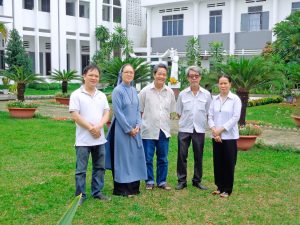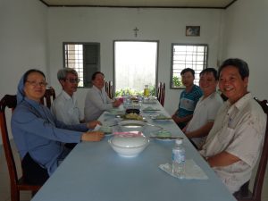 Chị Giám Tỉnh, chị Phụ trách Cộng đoàn và quý chị chào thăm Thầy. Thật mừng rỡ vì đã lâu từ ngày rời xa Quê hương, nay mới có dịp gặp lại Thầy tại cộng đoàn. Với những lời thăm hỏi, trò chuyện thân tình và tươi vui. Thầy còn trao tặng sách – món quà thật quý cho cộng đoàn. Dùng bữa trưa đơn sơ với những món đồng quê canh ngó khoai, cá bống kho tộ,…Thầy thích ”đúng là bữa cơm gia đình thật thân tình.” Trước khi ra về, Thầy đã viếng Thánh Thể nơi nguyện đường thân quen và hẹn ngày lễ của Tỉnh Dòng sẽ đến hiệp thông.